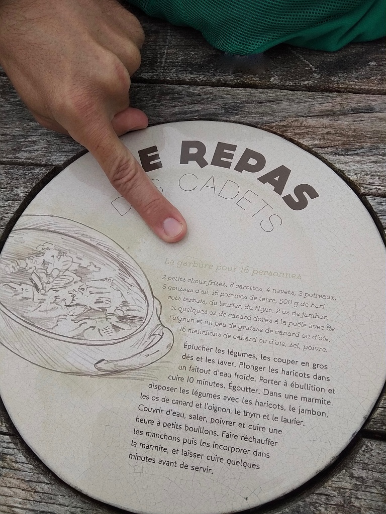 Ici, vous trouverez une table, pour passer un moment convivial, pique-niquer, jouer... mais pas n'importe quelle table ! On y découvre des recettes gasconnes, l'histoire du Pousse-Rapière, ou encore la manière dont un Cadet savoure un digestif...