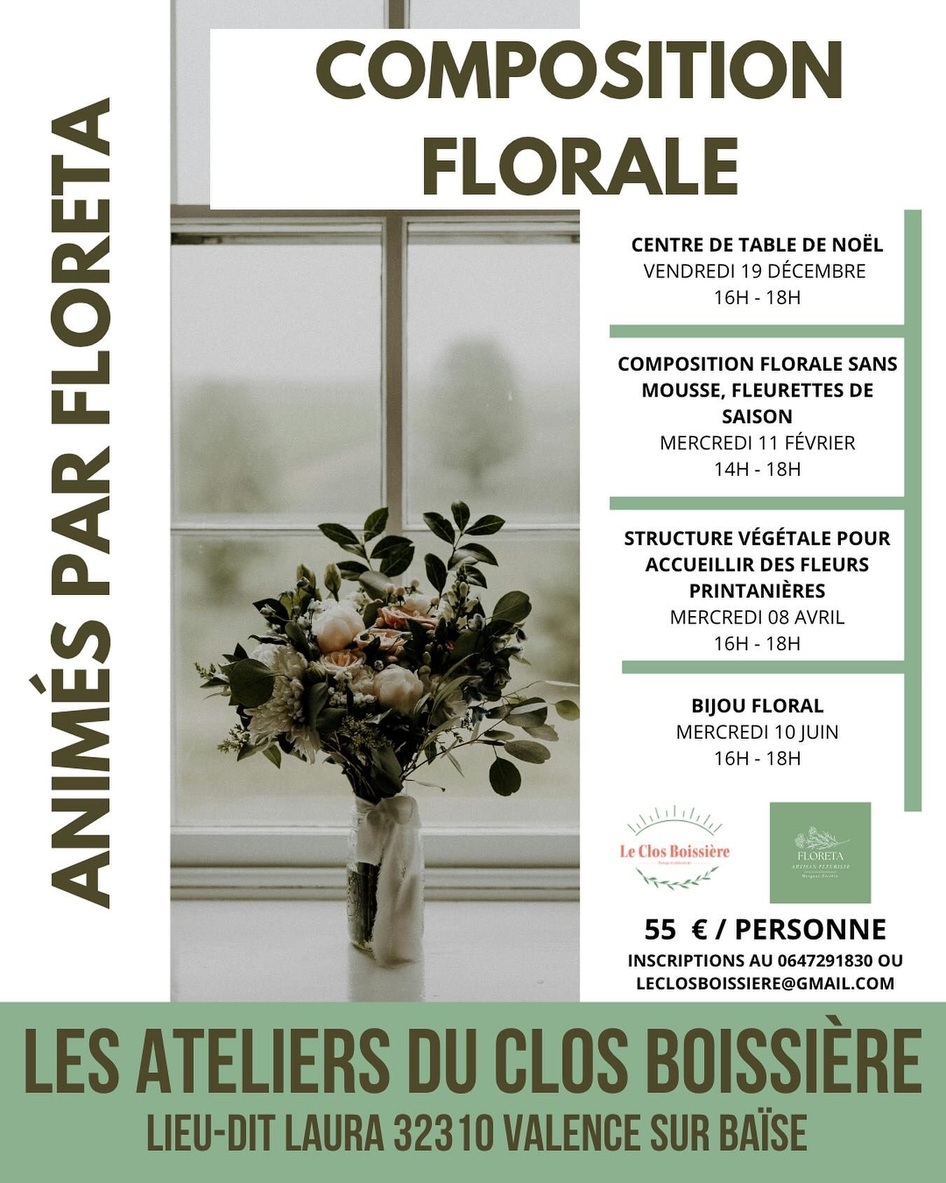 Le Clos Boissière en partenariat avec Floreta vous propose cette nouvelle saison d'ateliers de Composition florale, à Valence sur Baïse.