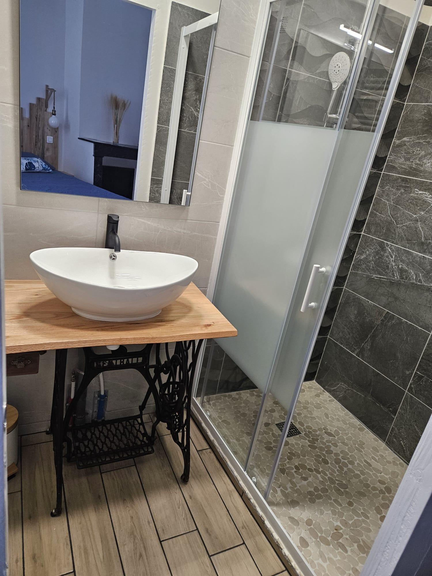 Spacieuse et confortable, elle est équipée d’un lit Queen size (160 x 200) et d’une salle de bain privative située face à la chambre.