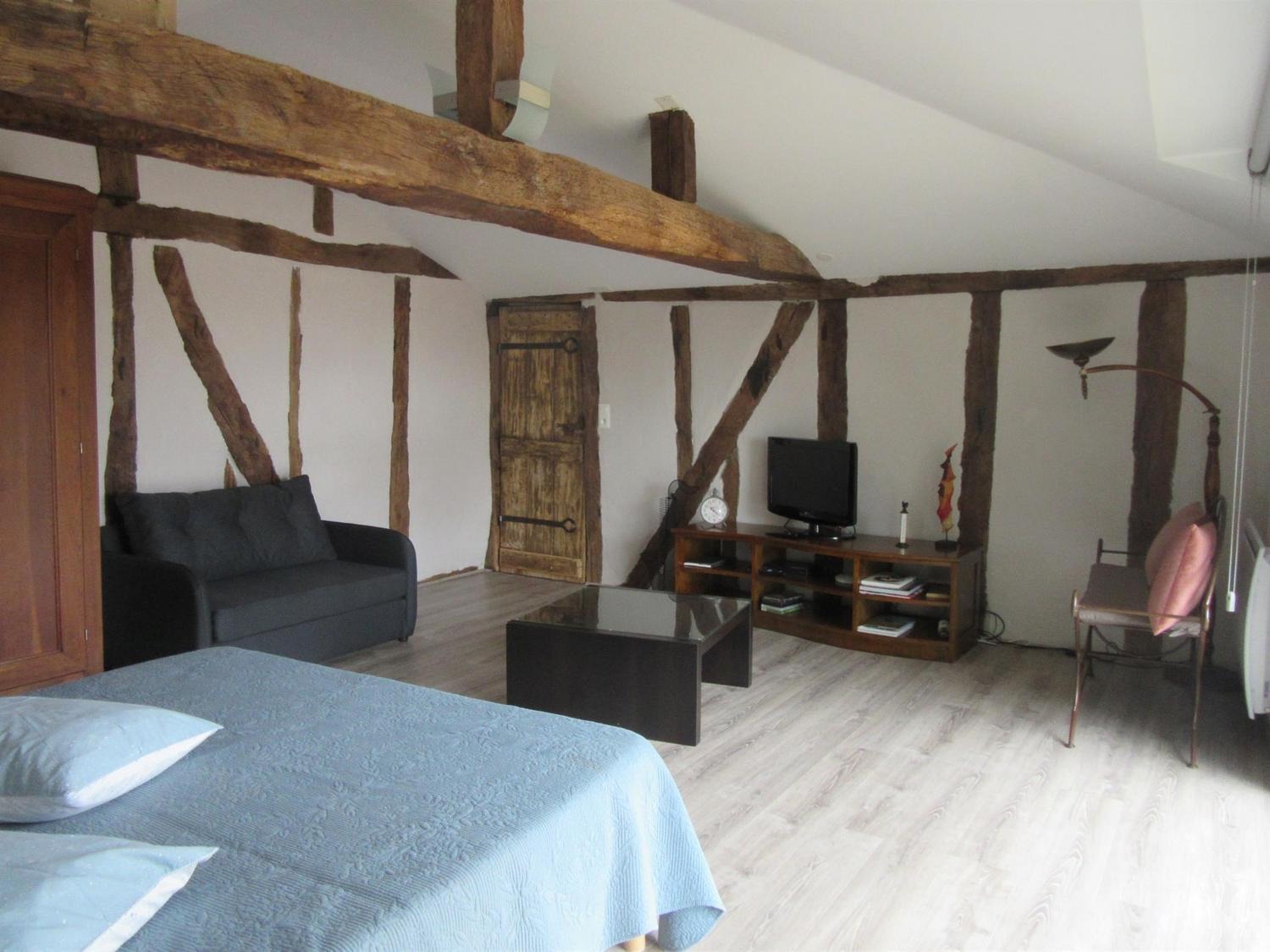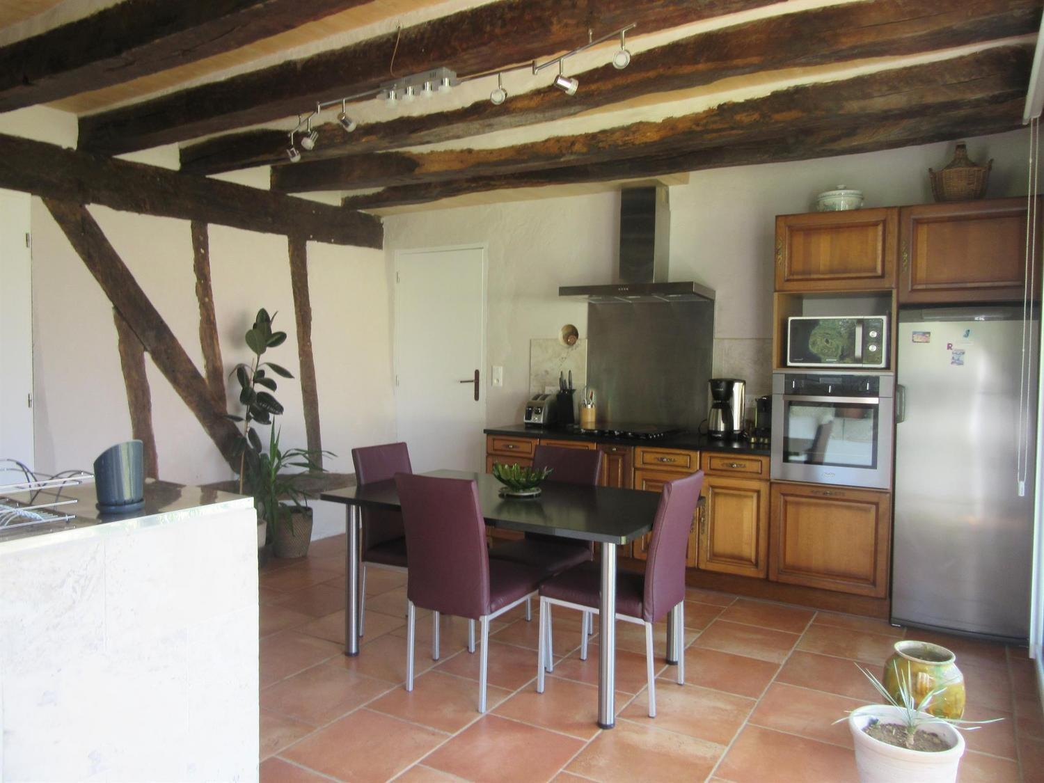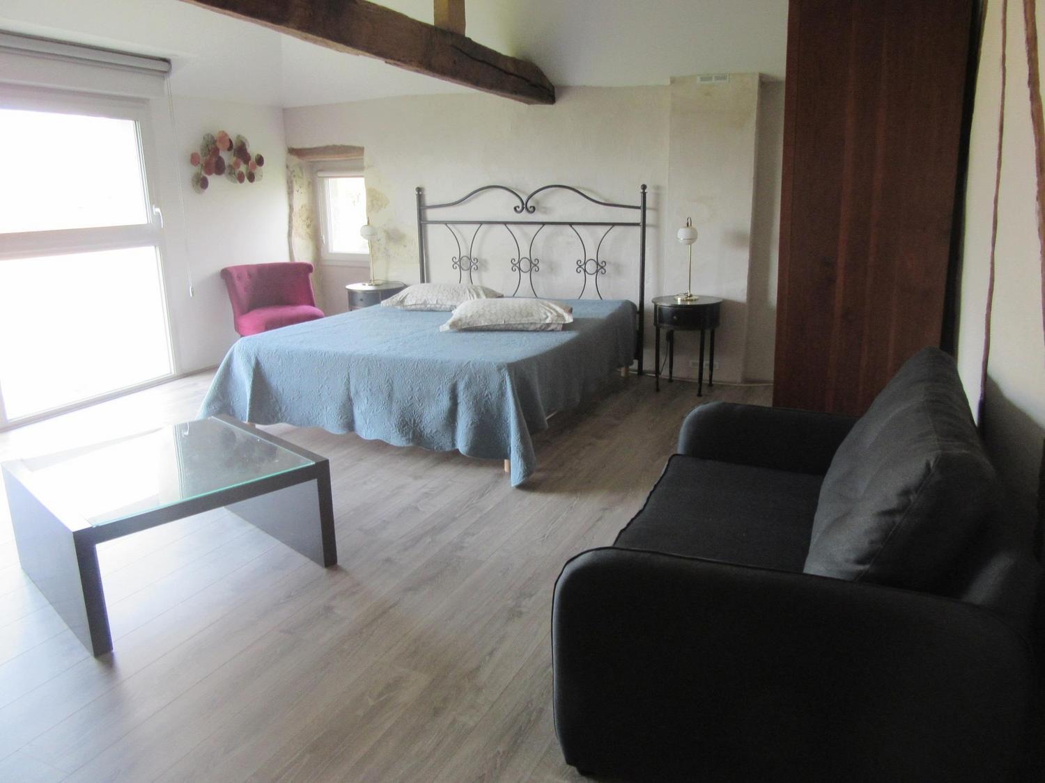 Aménagé dans 60m²: en rez-de-chaussée: hall d'entrée desservant la cuisine/salle à manger avec baie vitrée ouvrant sur terrasse, cellier, salle d'eau, wc. A l'étage, vous disposez d'une chambre avec 1 lit 160, un coin canapé convertible de110/200, TV/DVD, une grande baie vitrée et une vue imprenable sur la campagne. A votre disposition à l'extérieur: salon et table de jardin,2 transats et parasol. Équipement bébé sur demande: lit, chaise et barrières.