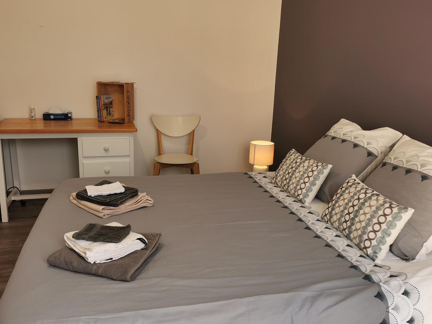 Equipée d'un lit en 160 avec un matelas épais, d'un bureau, d'un mini frigo, d'une armoire avec penderie et étagère.