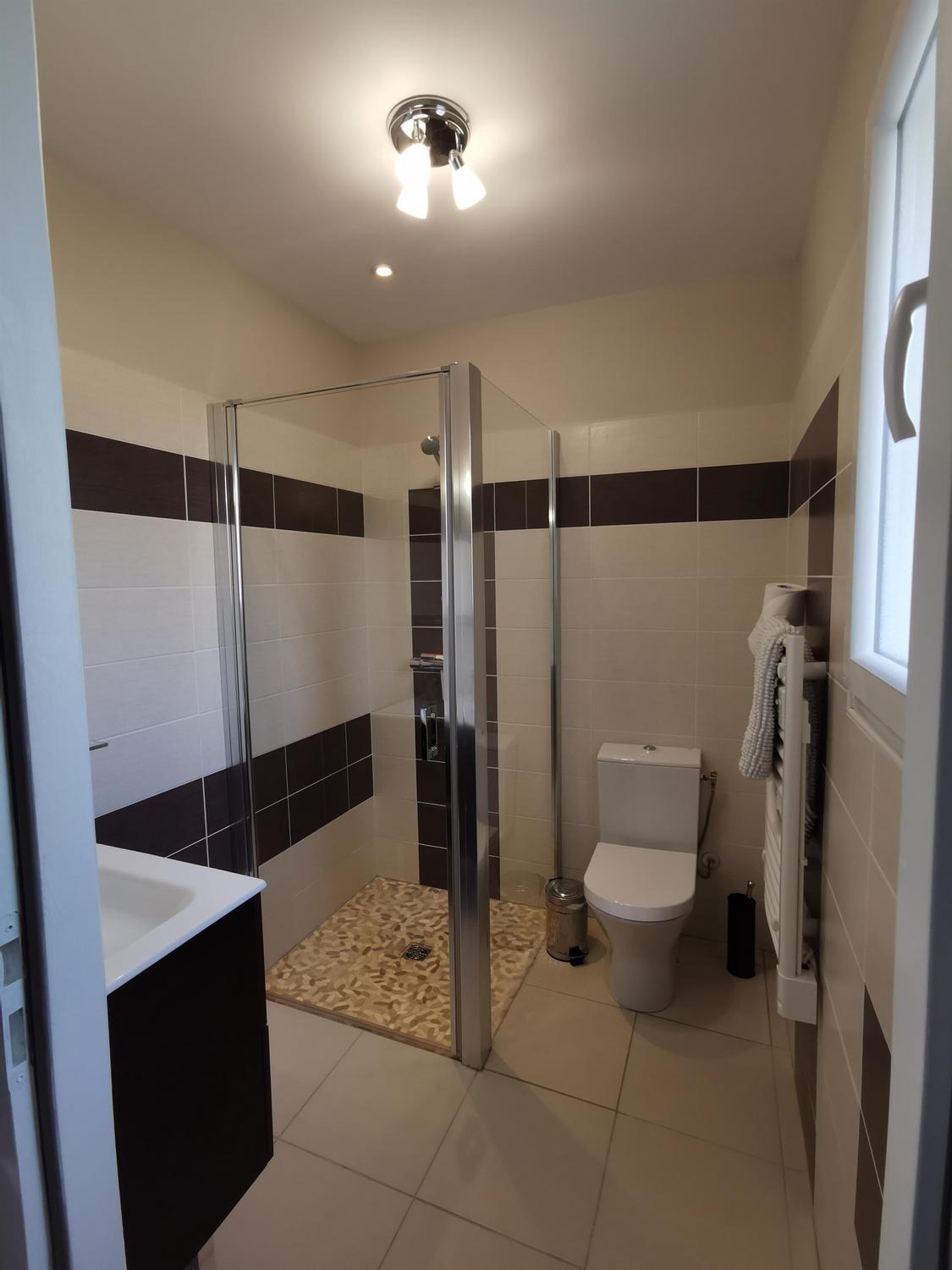 La salle d'eau privative dispose d'une douche à l'talienne, d'un wc, d'une vasque avec du rangement et d'un sèche-serviette.
