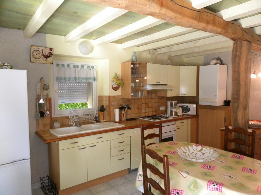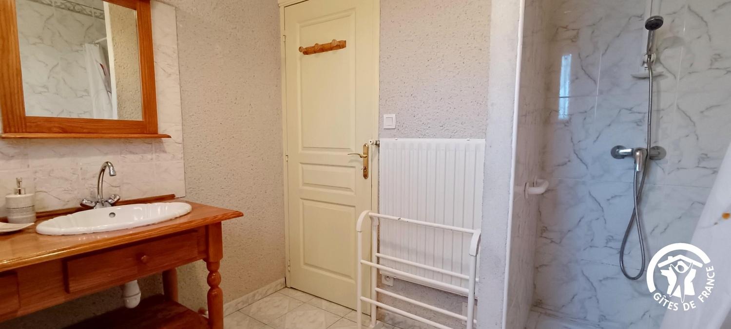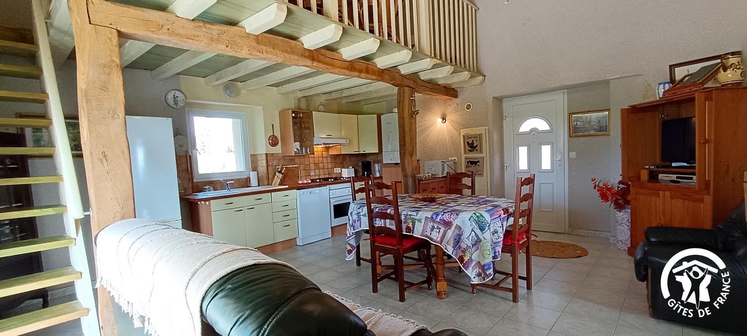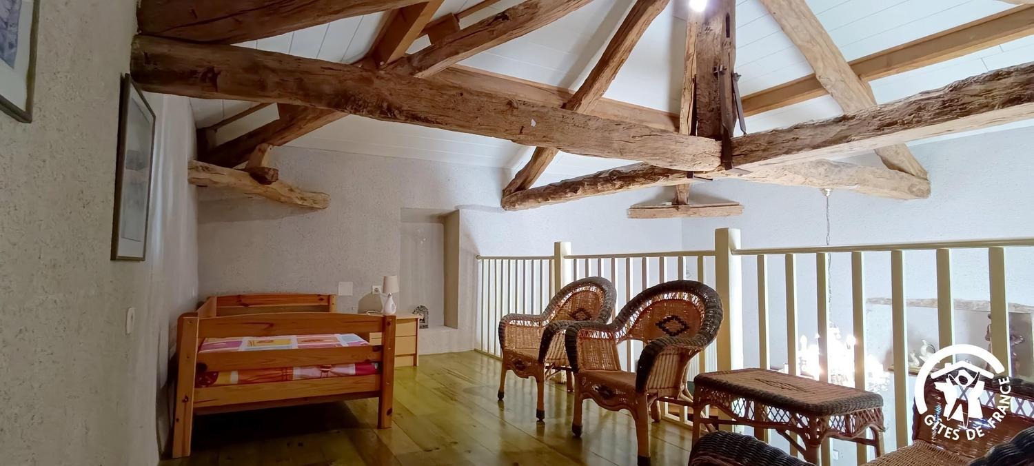 Séjour/coin cuisine avec large baie vitrée donnant plein sud et ancienne charpente en étoile restaurée, buanderie, 2 chambres (1 lit 140, 2 lits 120), salle d'eau avec siège de douche pour PMR, wc/lave-mains. Mezzanine mansardée (1 lit d'appoint 90), accessible par échelle meunière avec coin-salon. Pas de barbecue car sapins aux alentours cause sècheresse.