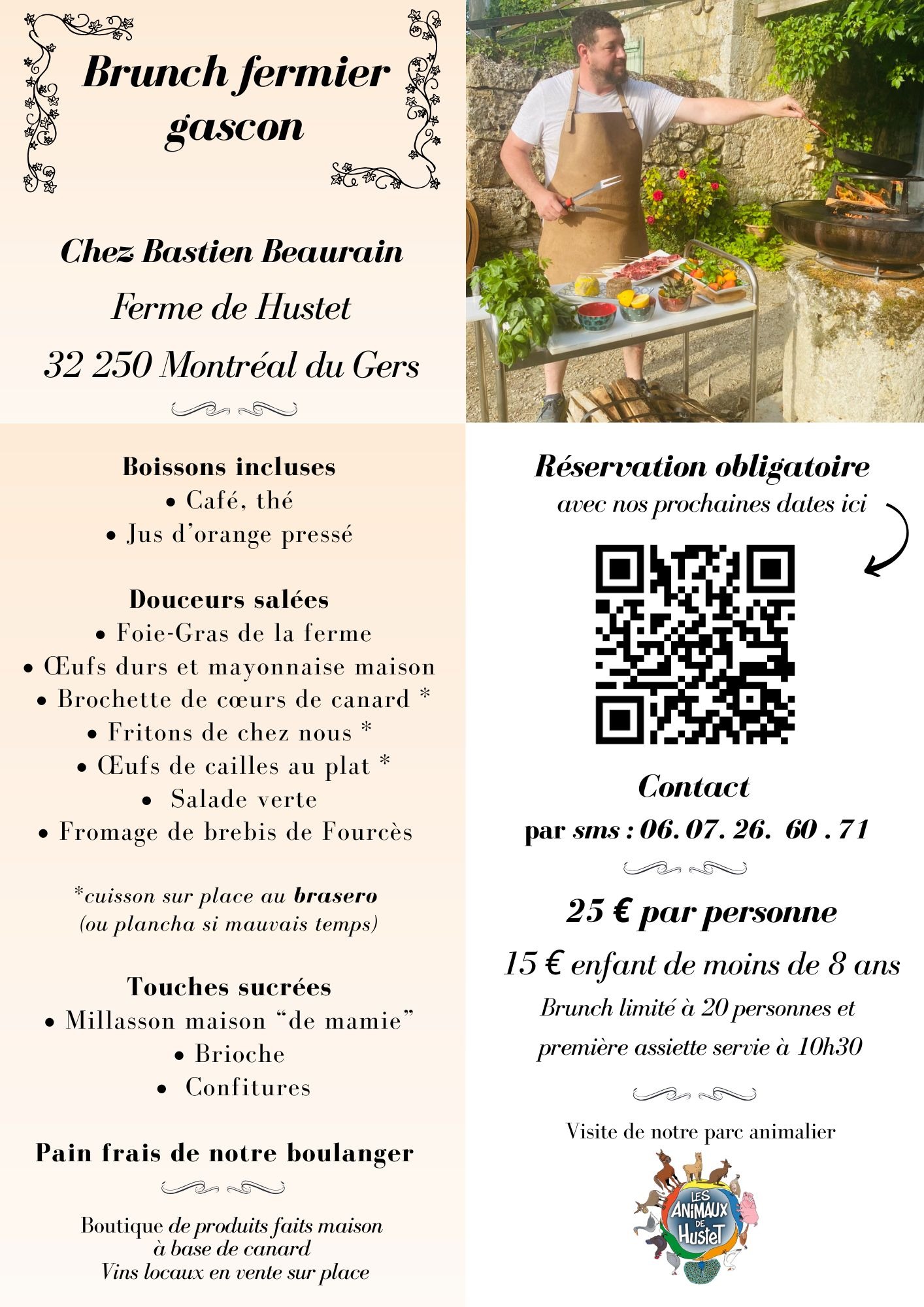 La Ferme de Hustet est spécialisée dans la production de produits de qualité à base de canard. Ainsi, nous proposons sur réservation des brunchs à 25 euros par personne et des paniers pique-nique à 22€ pour 2 personnes et 40€ pour 4 personnes (pain, foie gras, rillettes, tomates/salade, chips, fruits, bouteilles d'eau) qu'il est possible de déguster au coeur même du parc, sur des tables aménagées, à l'ombre des chênes centenaires.