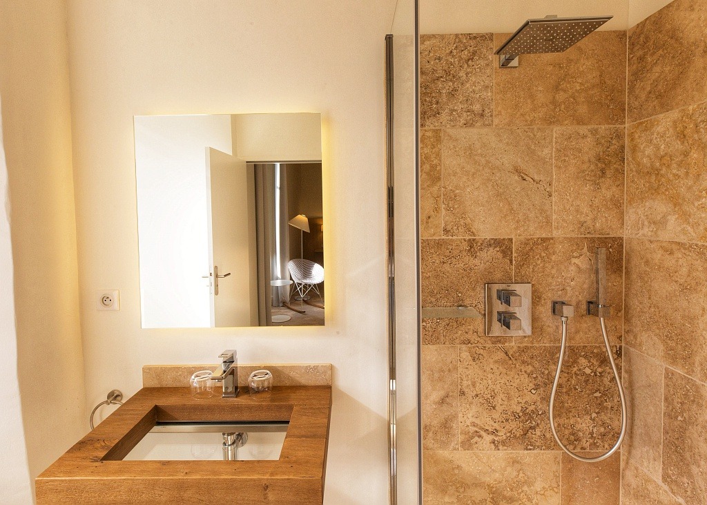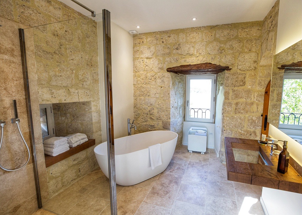Salle de bain avec douche à l’italienne en travertin et vitraux d’époque