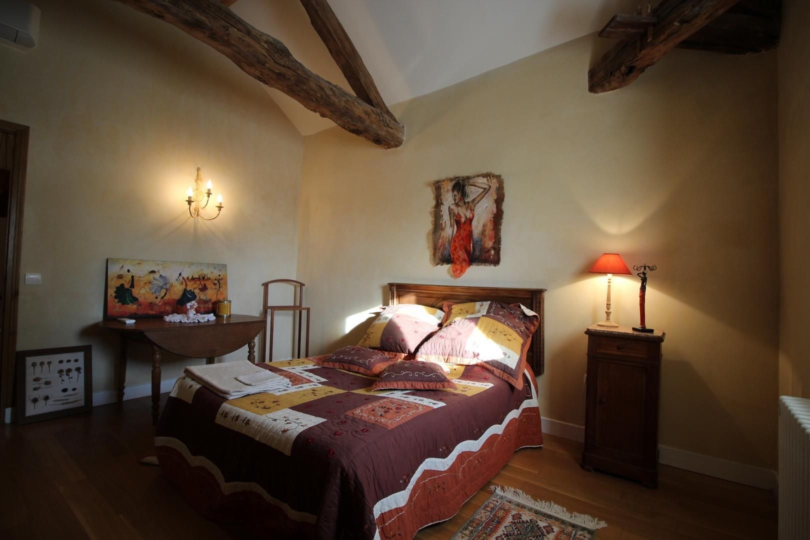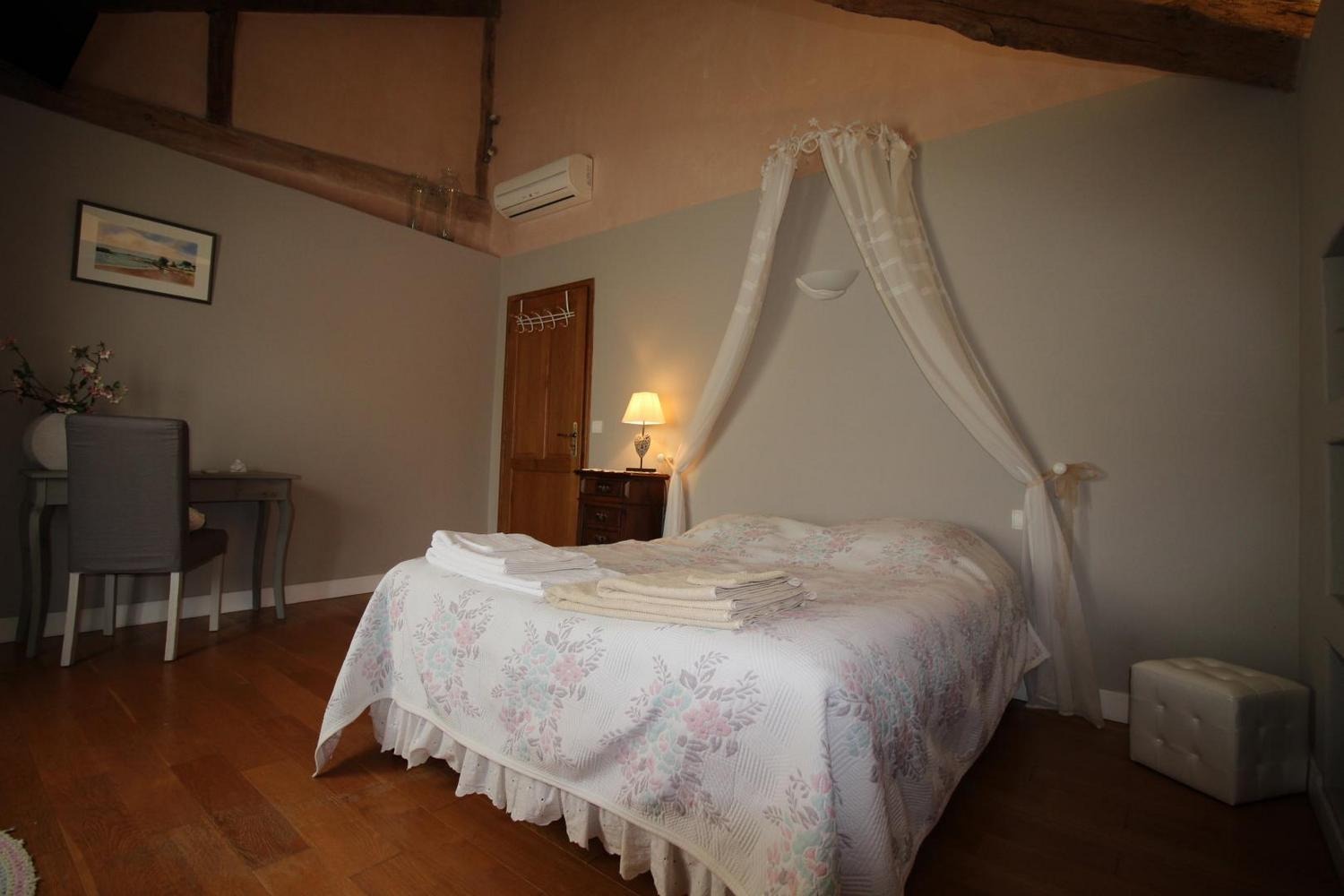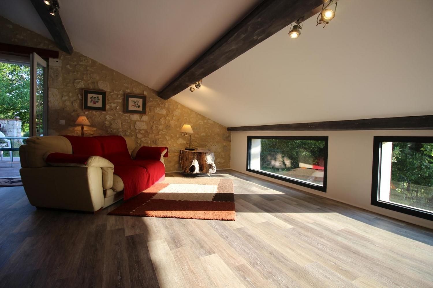 Mitoyen à l'habitation des propriétaires, gîte de 100m² aménagé en rez-de-chaussée et étage (accès par un couloir commun aux propriétaires). Séjour ouvrant sur la terrasse privative, buanderie, à l'étage: chambre 1 avec 1 lit 140 (télévision), chambre 2 avec 1 lit 140, salle d'eau avec wc. Climatisation réversible dans les chambres.