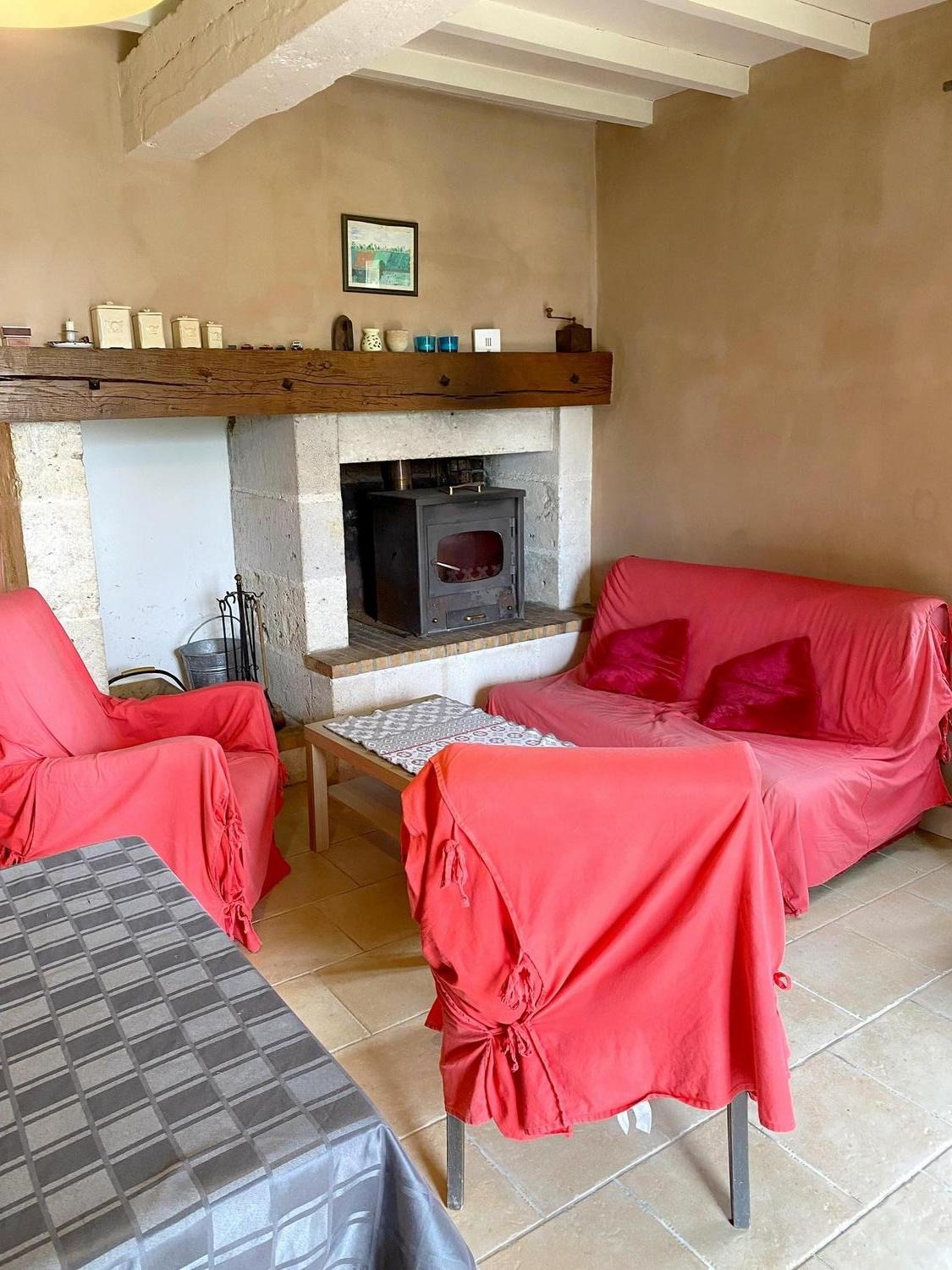 A la campagne, dans une ancienne ferme isolée, maison en pierre adossée à une ancienne grange : terrasse couverte, terrain privatif avec piscine privée hors-sol semi-enterrée sécurisée , transats.
