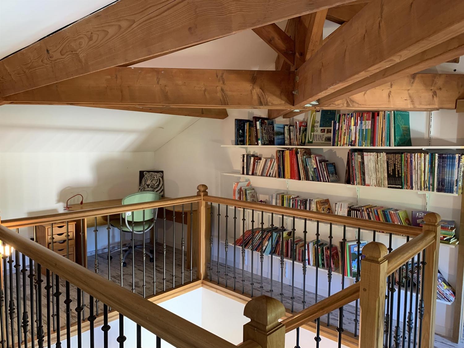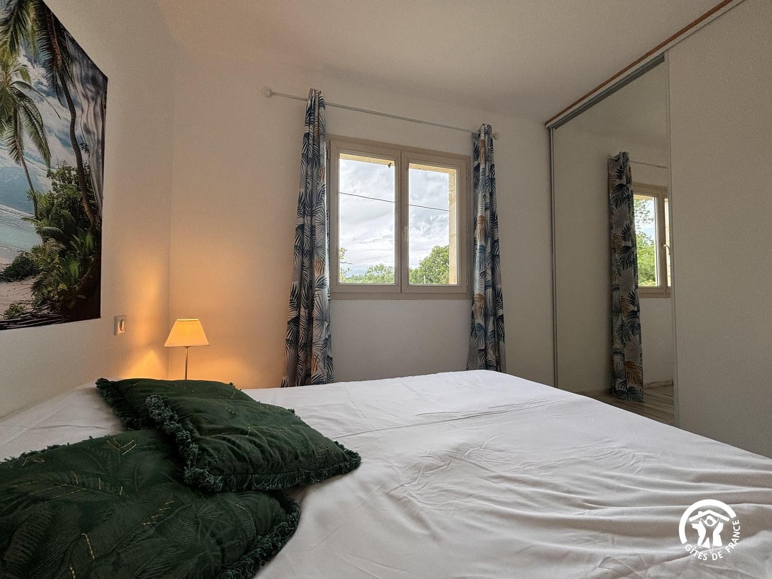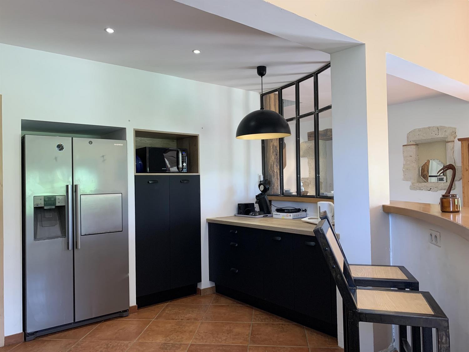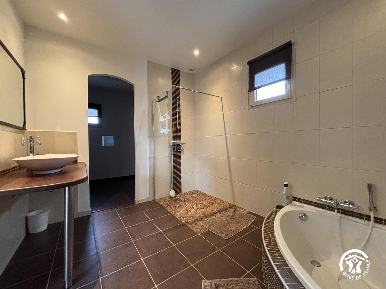 Un grand séjour très lumineux ouvrant sur la terrasse en partie couverte, cuisine ouverte séparée par une verrière, arrière cuisine (cuisson, buanderie), un wc indépendant. Le couloir dessert une salle d'eau avec wc, une première chambre avec 1 lit 140 mezzanine, 1 seconde chambre avec 1 lit 140 et une chambre parentale avec salle de bains + douche et dressing, avec sortie directe sur la terrasse. A l'étage mansardé, une grande bibliothèque avec bureau est à votre disposition, une chambre avec un lit 140.