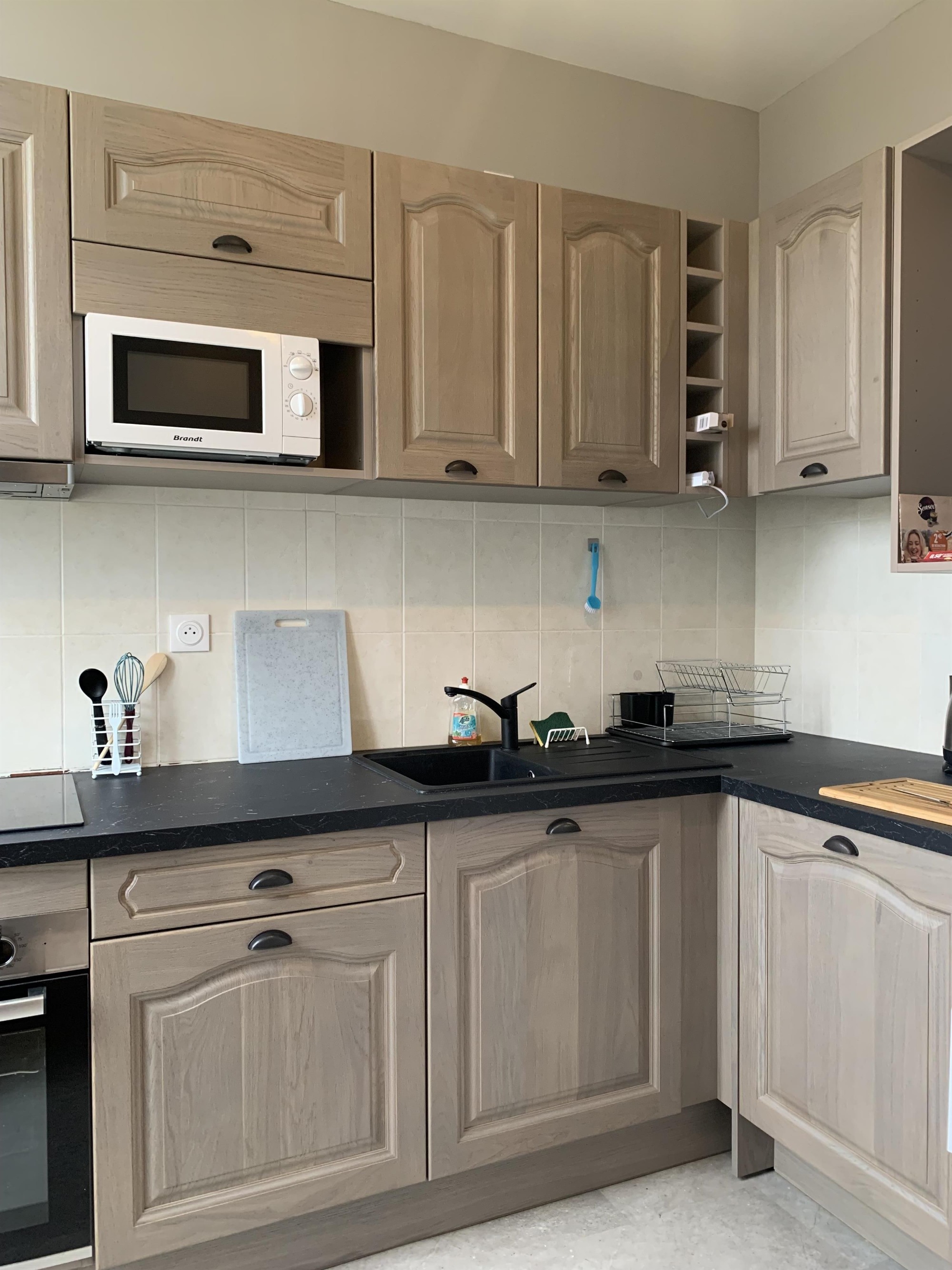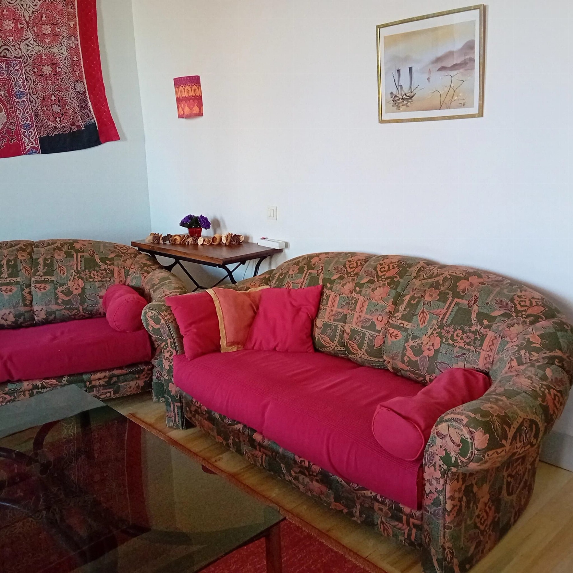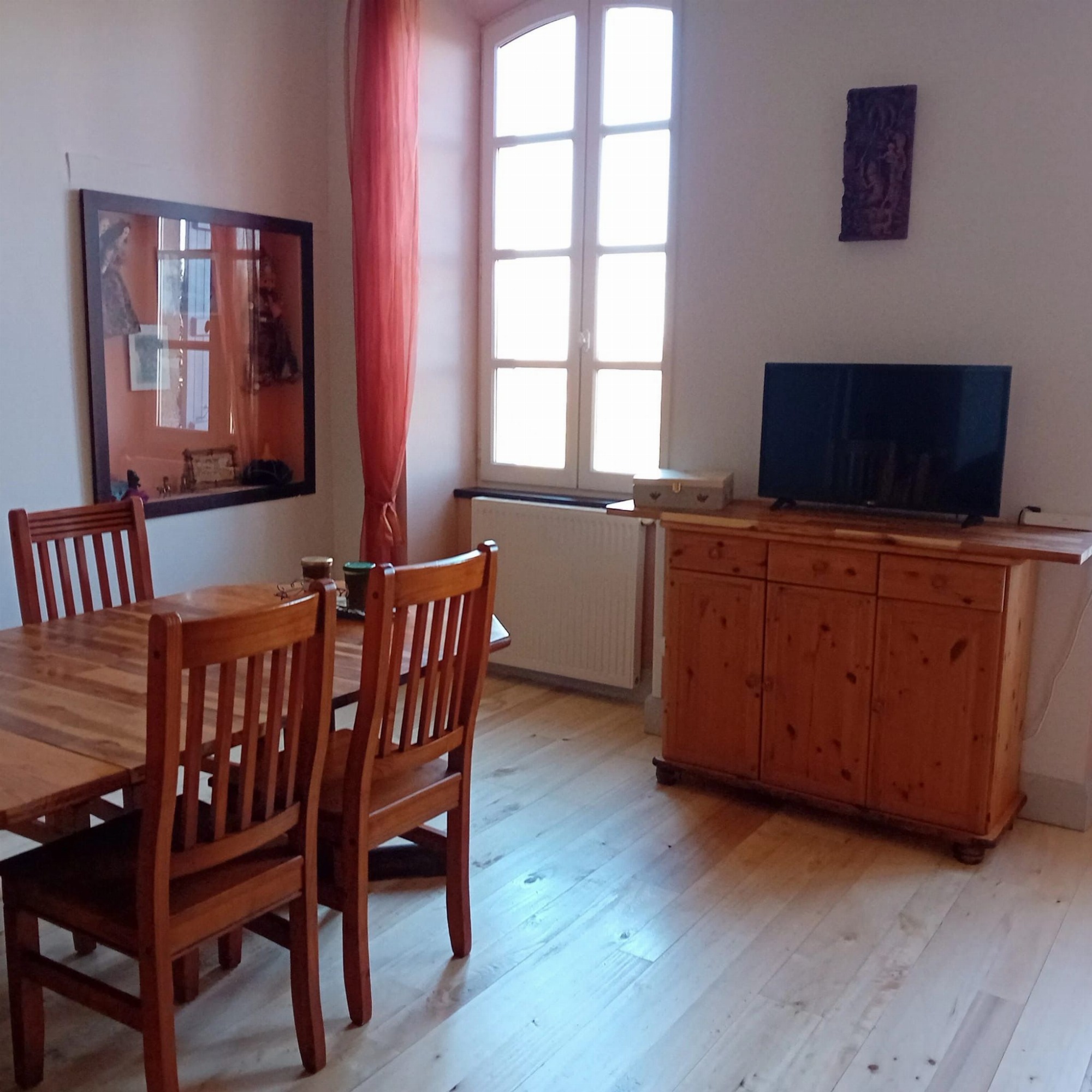 Le séjour spacieux et parqueté offre une partie salon avec 3 canapés et une partie salle à manger avec télévision, attenante à la cuisine toute équipée et lumineuse.