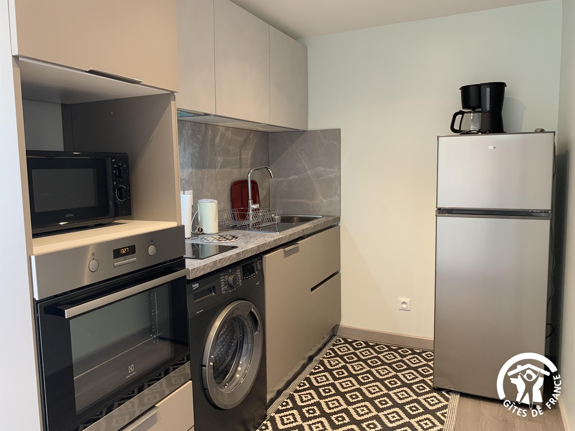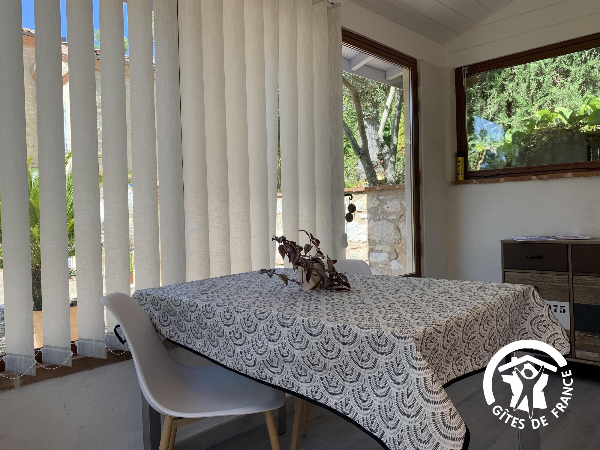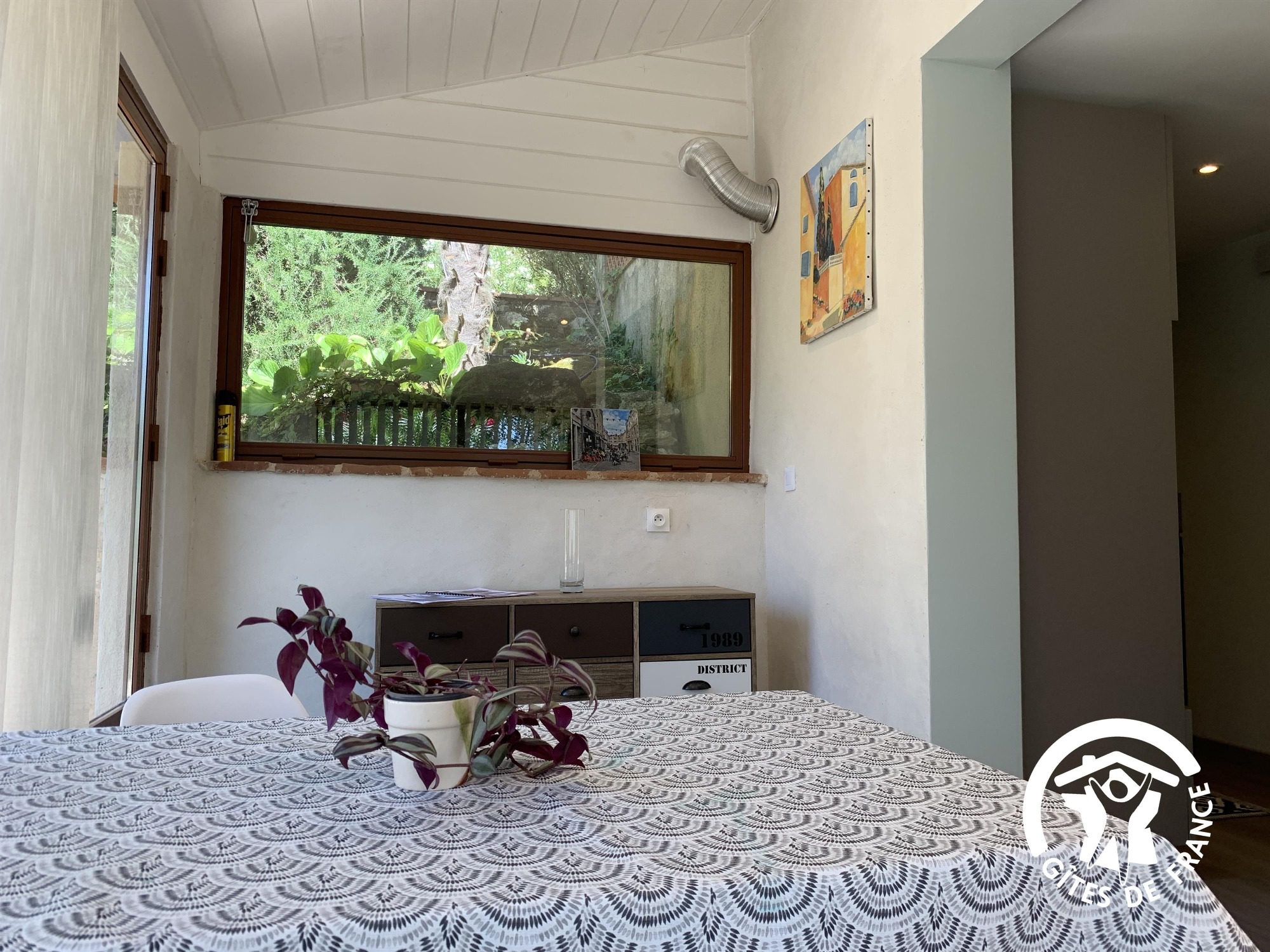 Le gîte se compose d'une véranda aménagée en espace repas et détente, une cuisine, une chambre avec 1 lit 140 et sa salle d'eau avec wc.
