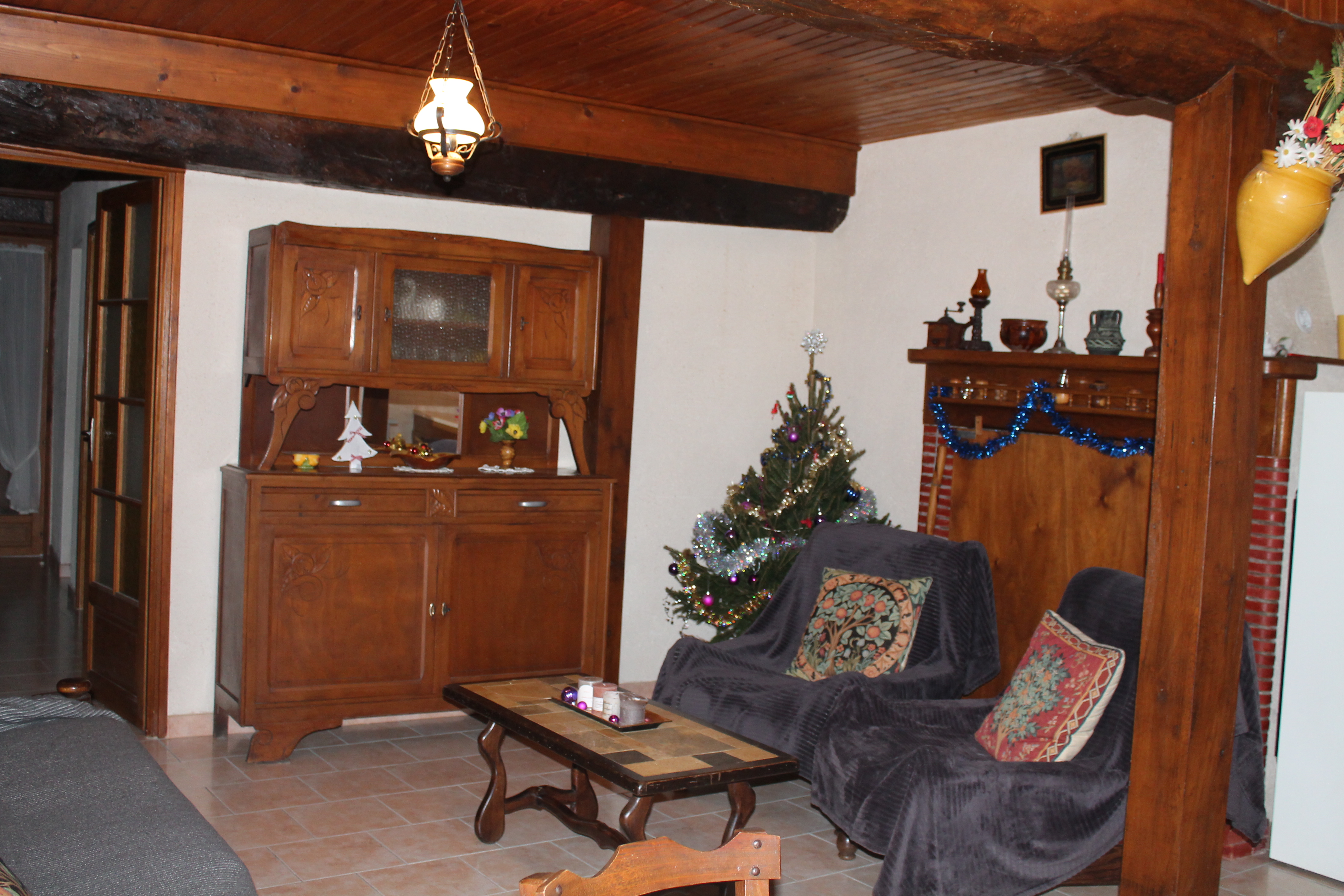 - Cuisine-séjour avec un coin salon avec cheminée et canapé convertible.