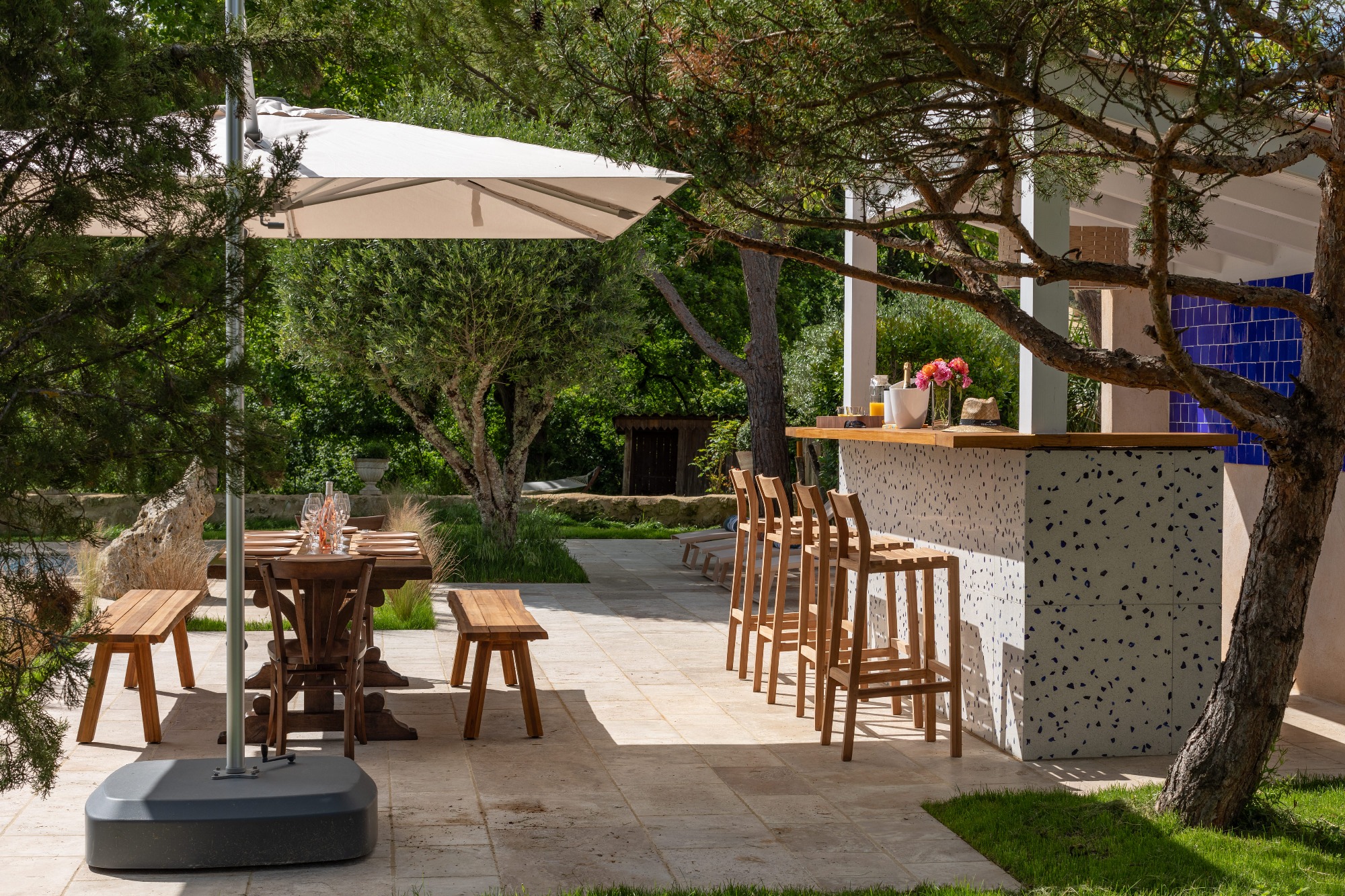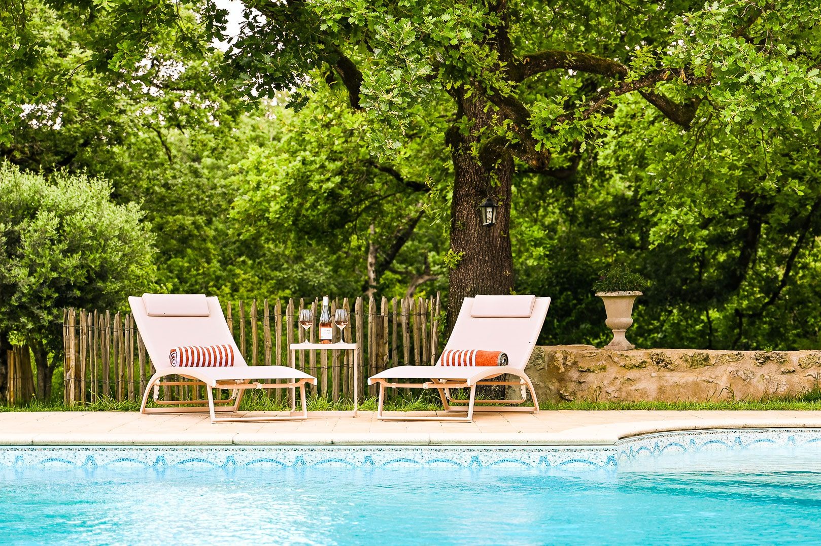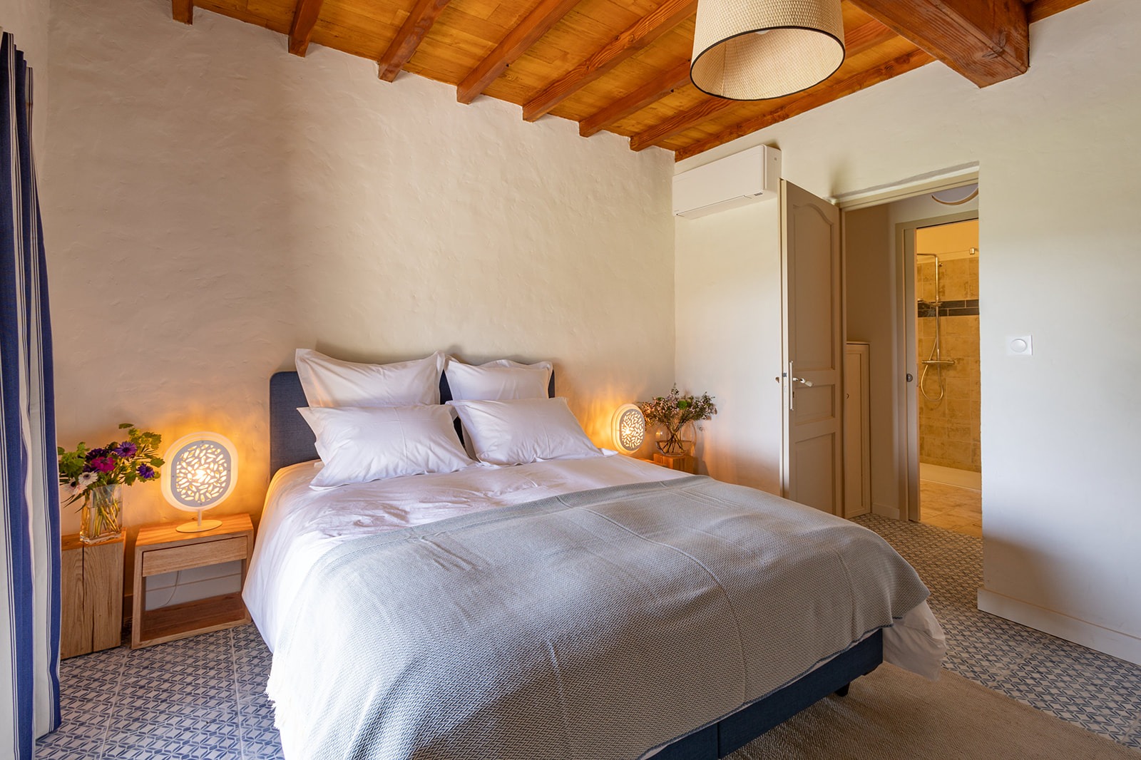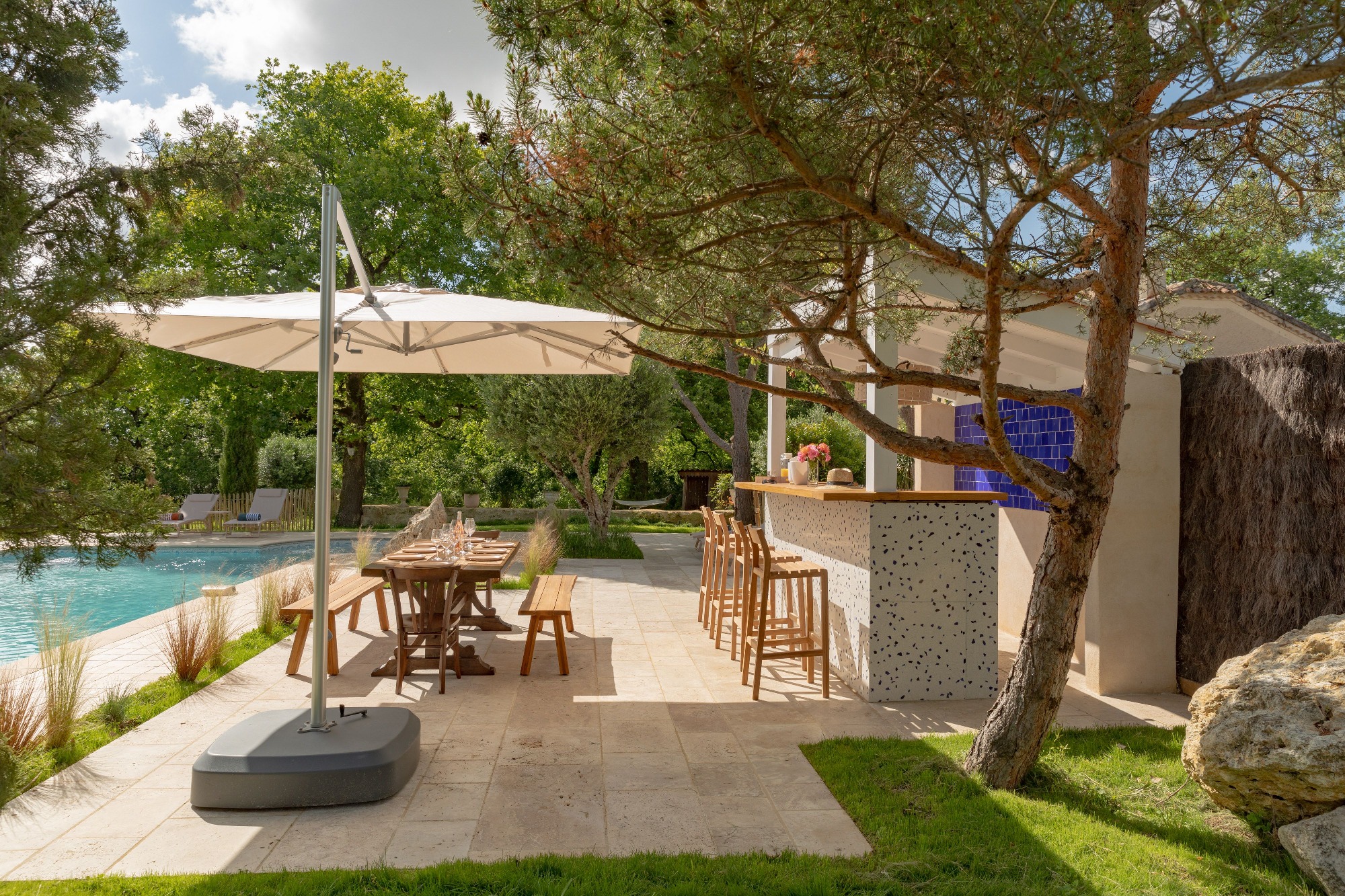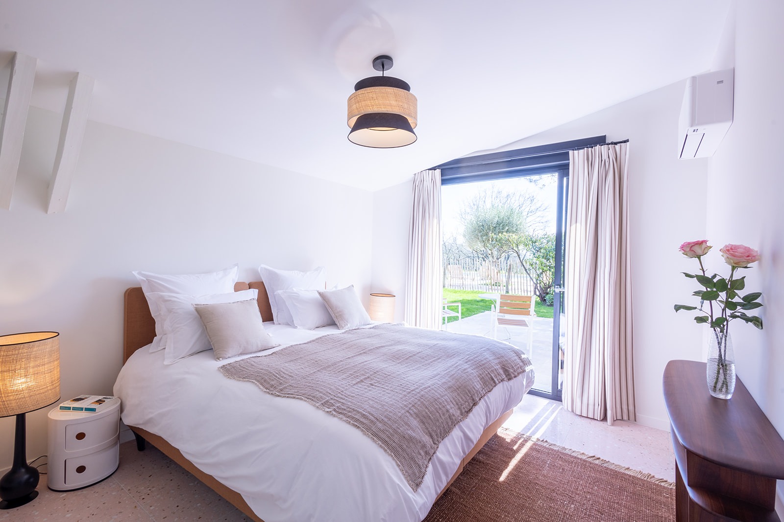 A quelques pas des deux maisons, la piscine a son univers propre avec son Pool bar (frigo, plaques à induction, évier, machine à café, verrerie sécurisée pour les extérieurs), sa pergola ornée de rideaux blancs qui dissimulent un lit de massage en plein air et ses chaises longues élégantes. Cafés du matin, déjeuner au soleil ou apéro au couchant, on s’attache facilement à cet endroit. Les serviettes de piscine sont bien entendu fournies.