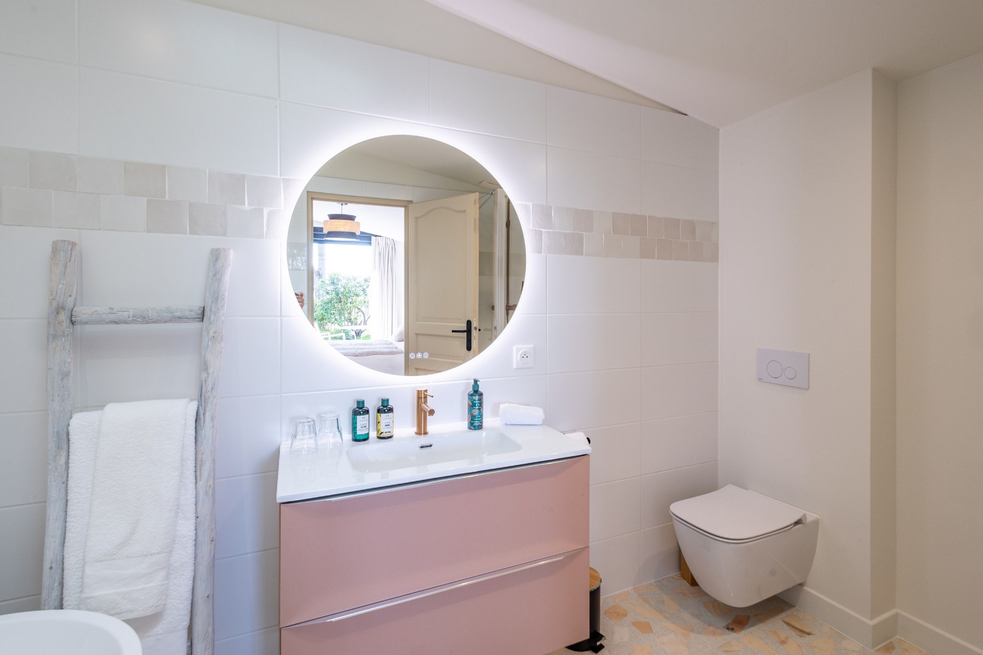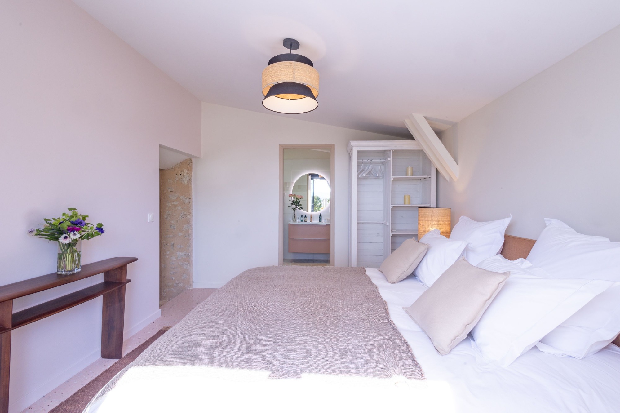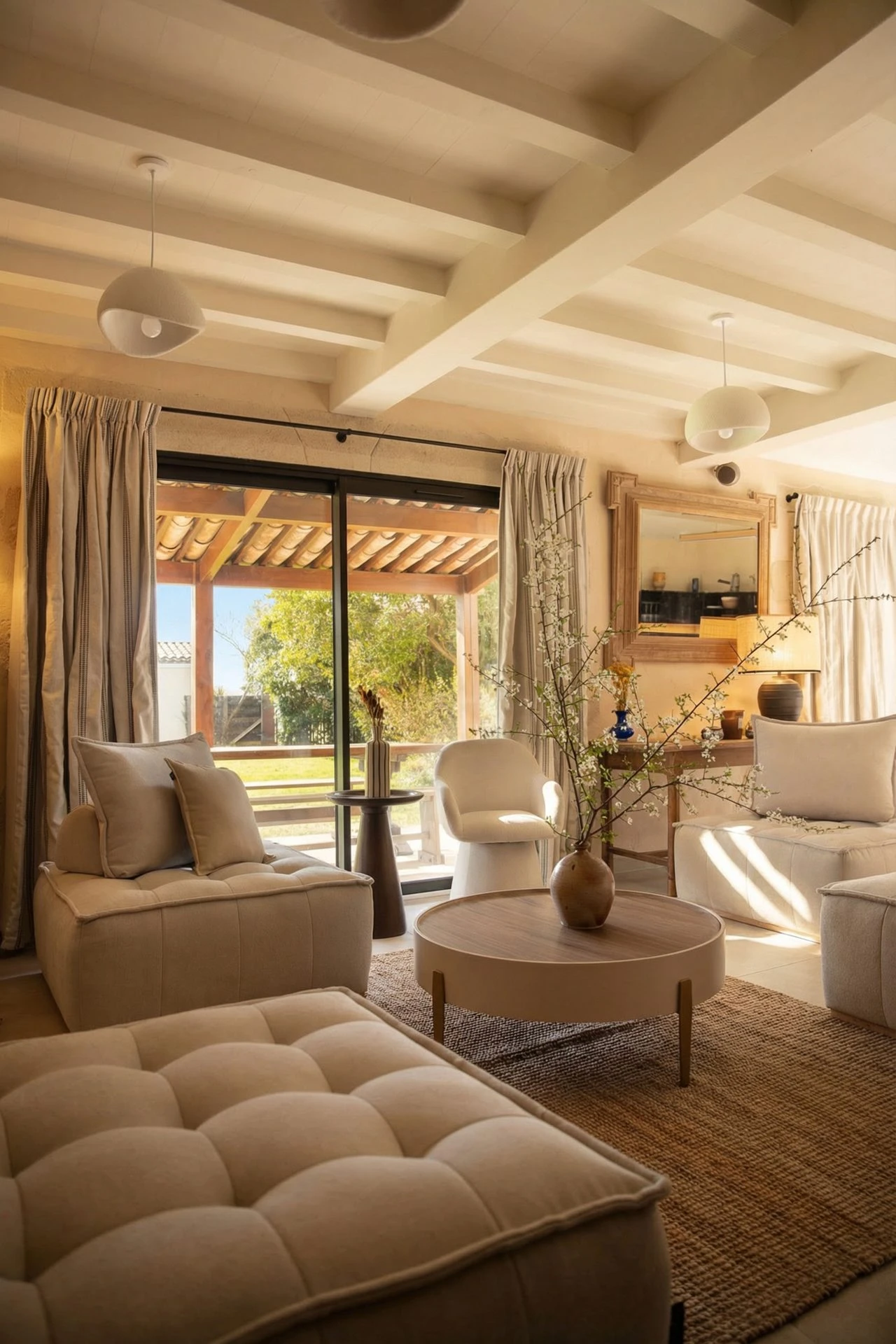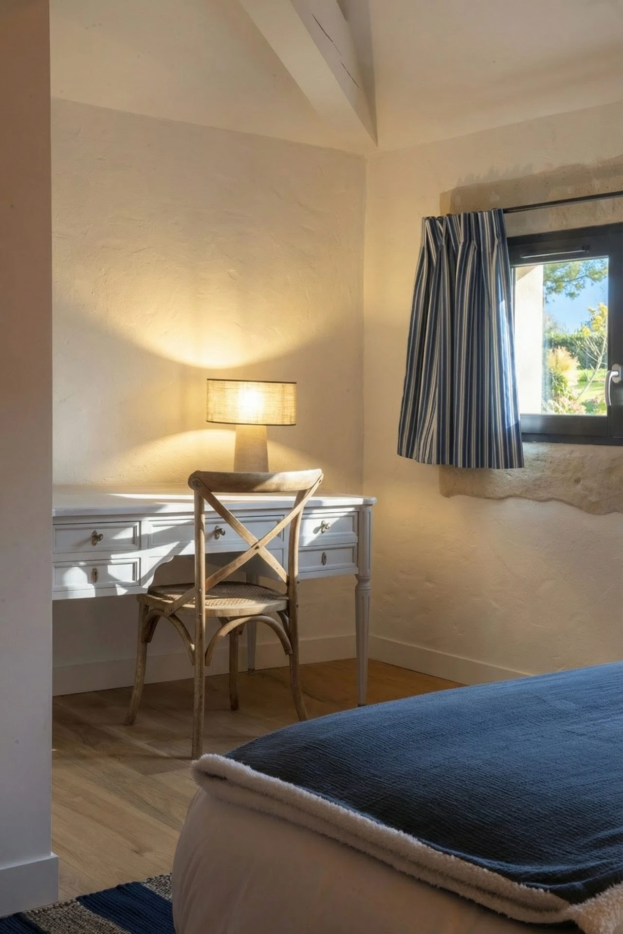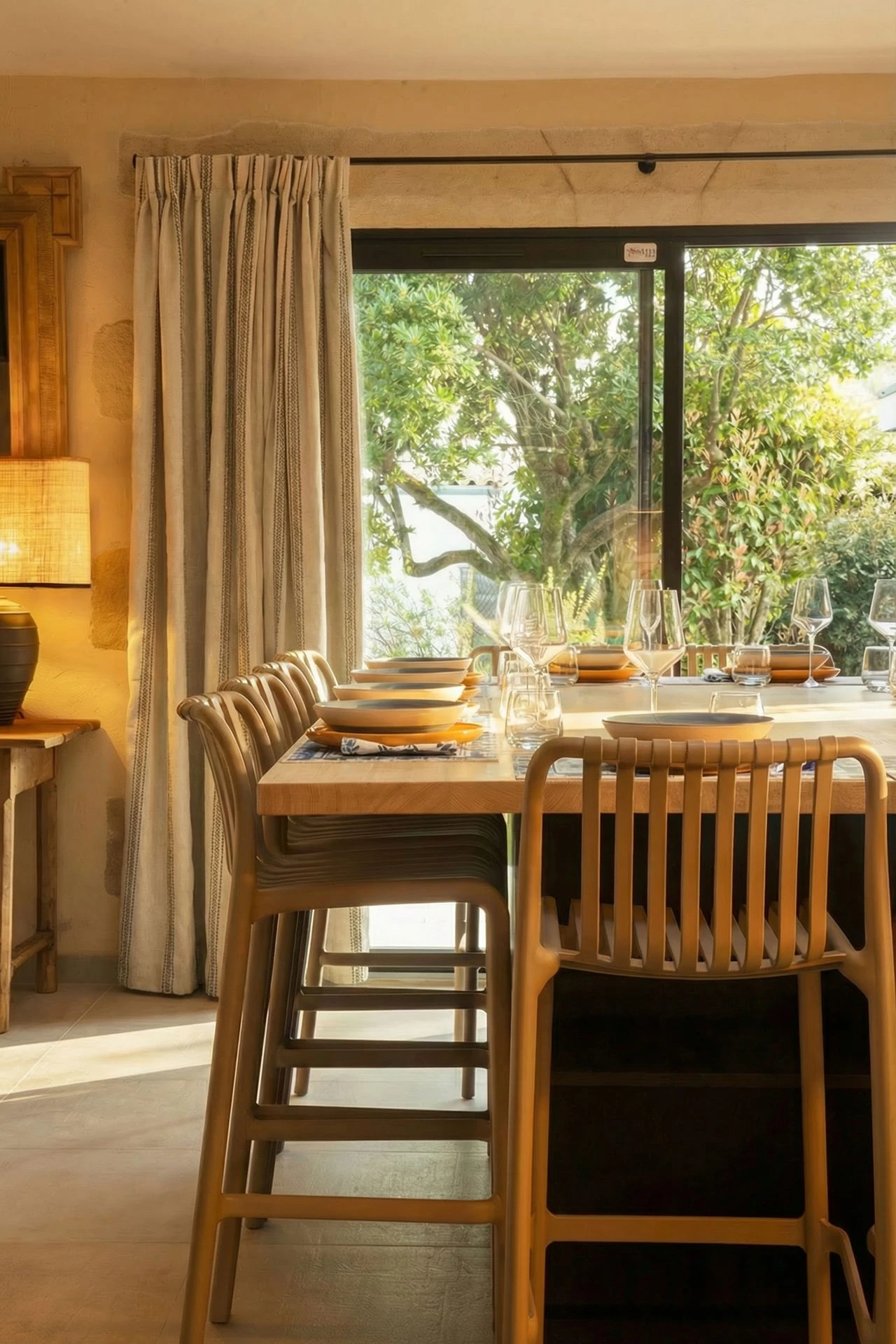 A quelques pas des deux maisons, la piscine a son univers propre avec son Pool bar (frigo, plaques à induction, évier, machine à café, verrerie sécurisée pour les extérieurs), sa pergola ornée de rideaux blancs qui dissimulent un lit de massage en plein air et ses chaises longues élégantes. Cafés du matin, déjeuner au soleil ou apéro au couchant, on s’attache facilement à cet endroit. Les serviettes de piscine sont bien entendu fournies.