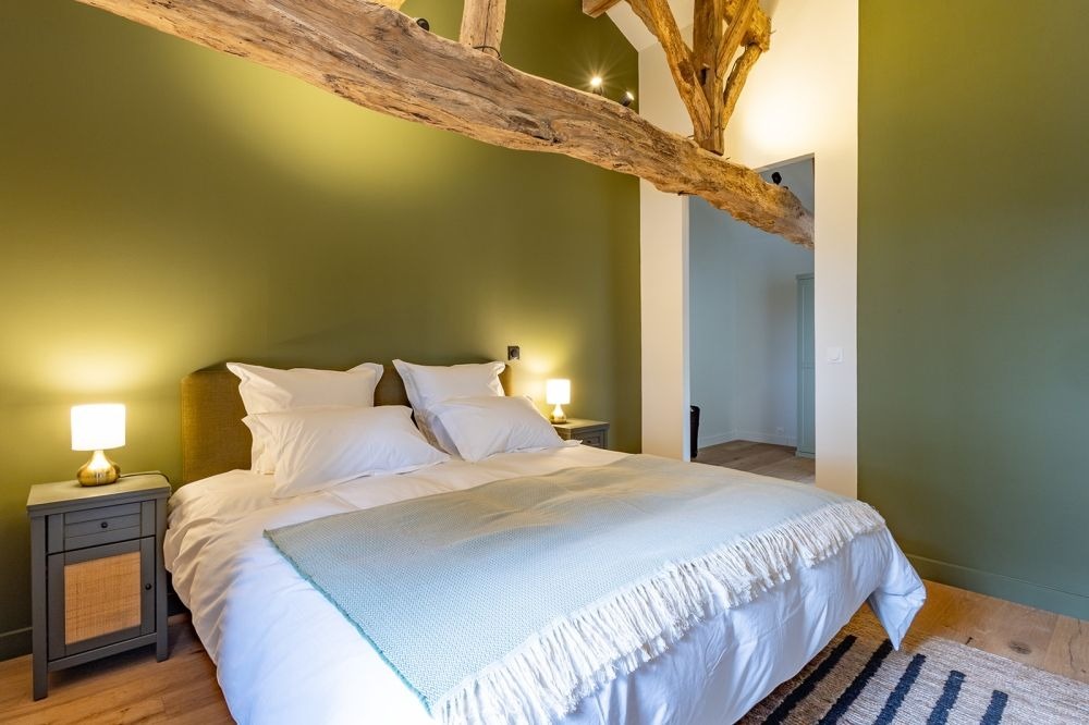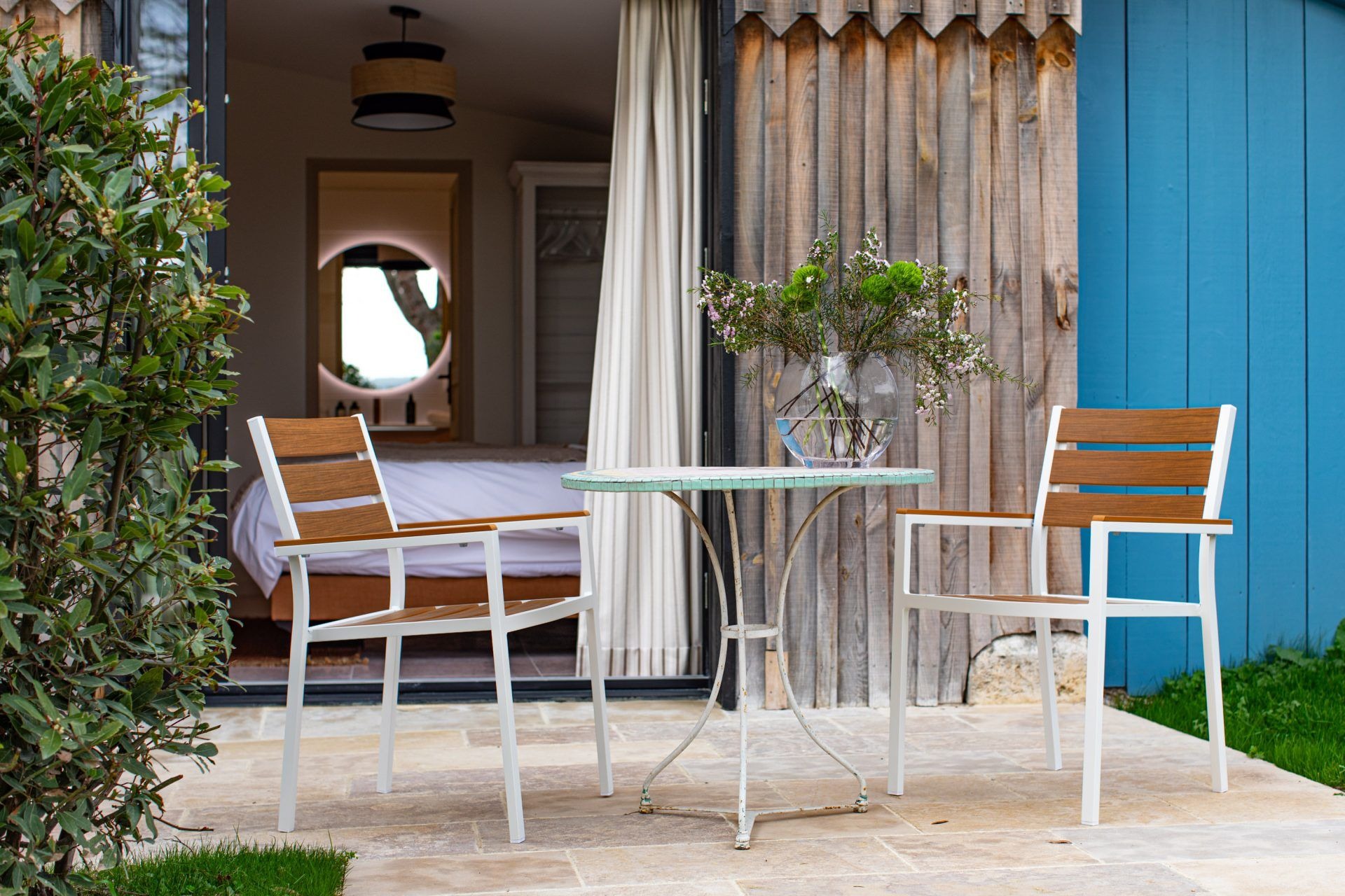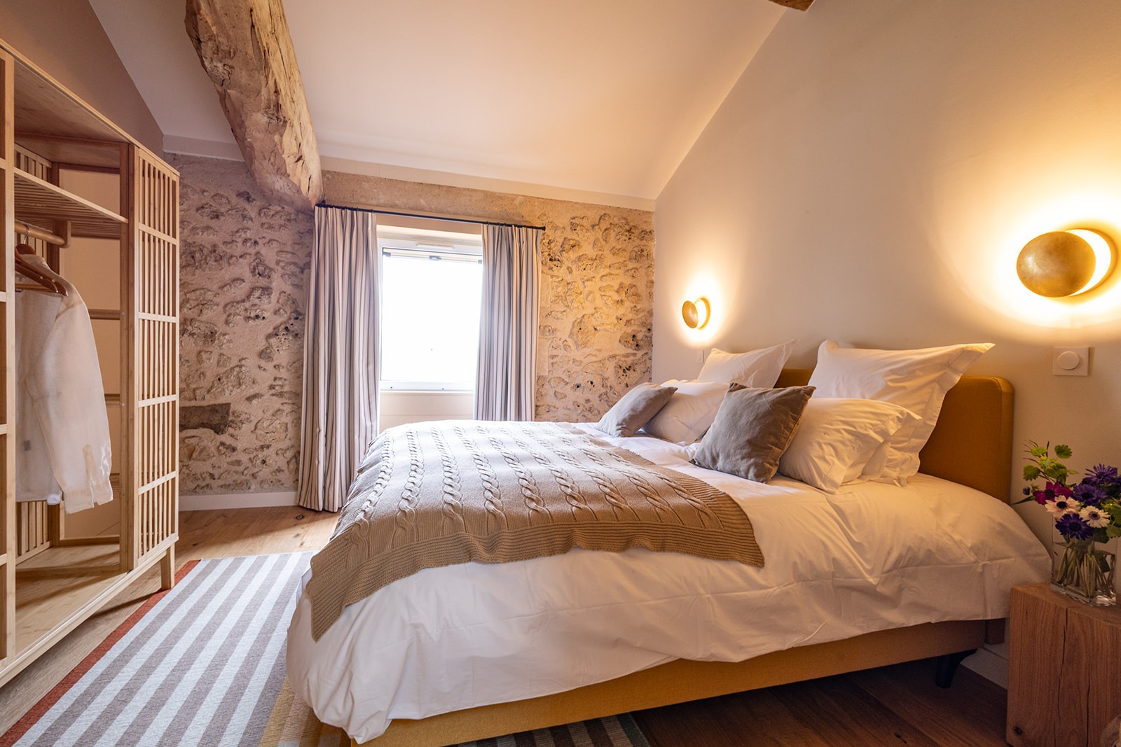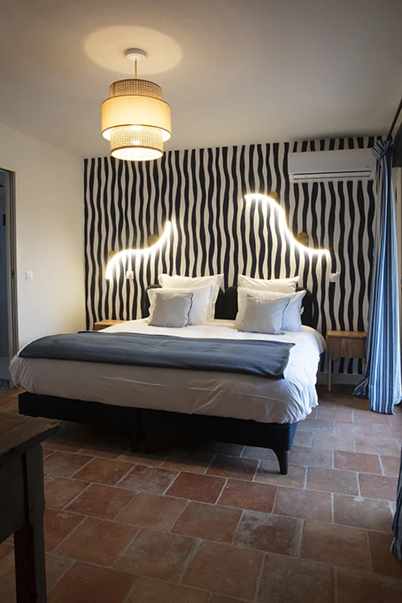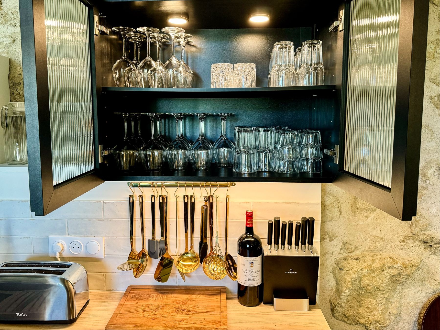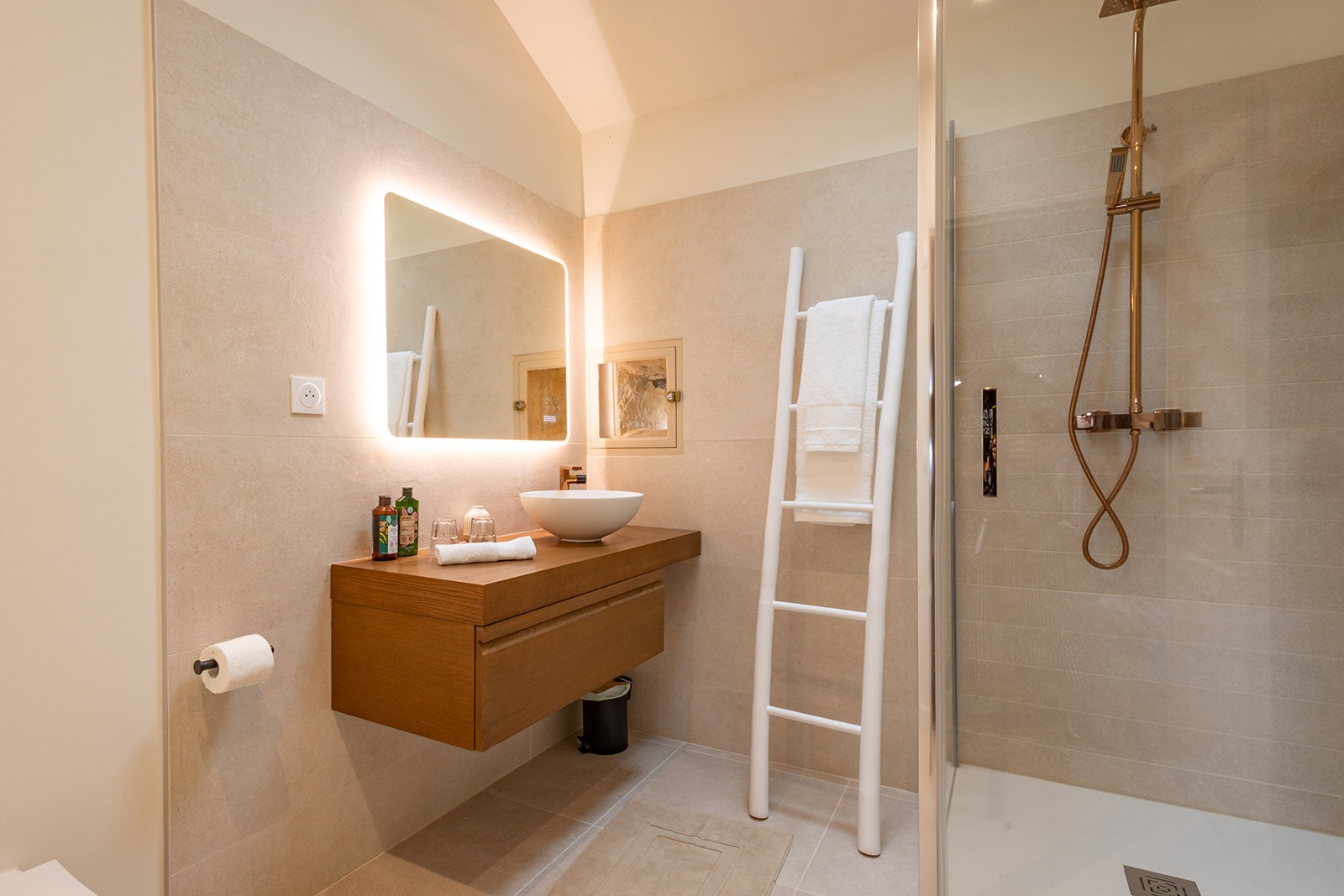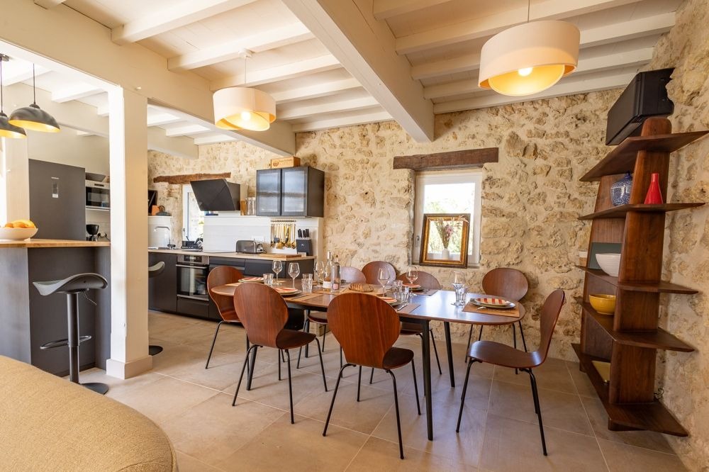 A quelques pas des deux maisons, la piscine a son univers propre avec son Pool bar (frigo, plaques à induction, évier, machine à café, verrerie sécurisée pour les extérieurs), sa pergola ornée de rideaux blancs qui dissimulent un lit de massage en plein air et ses chaises longues élégantes. Cafés du matin, déjeuner au soleil ou apéro au couchant, on s’attache facilement à cet endroit. Les serviettes de piscine sont bien entendu fournies.