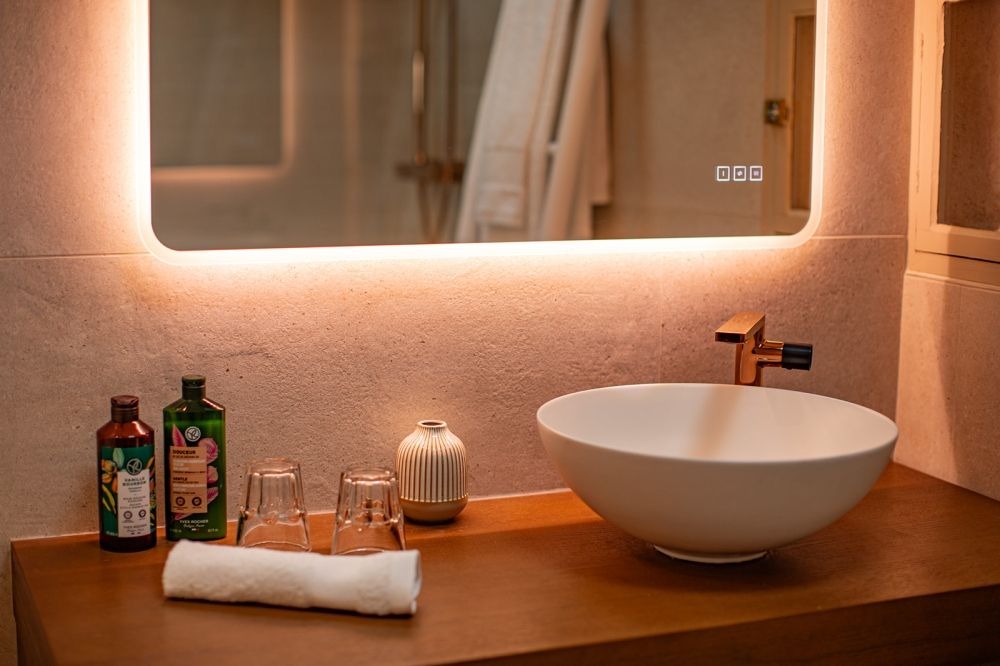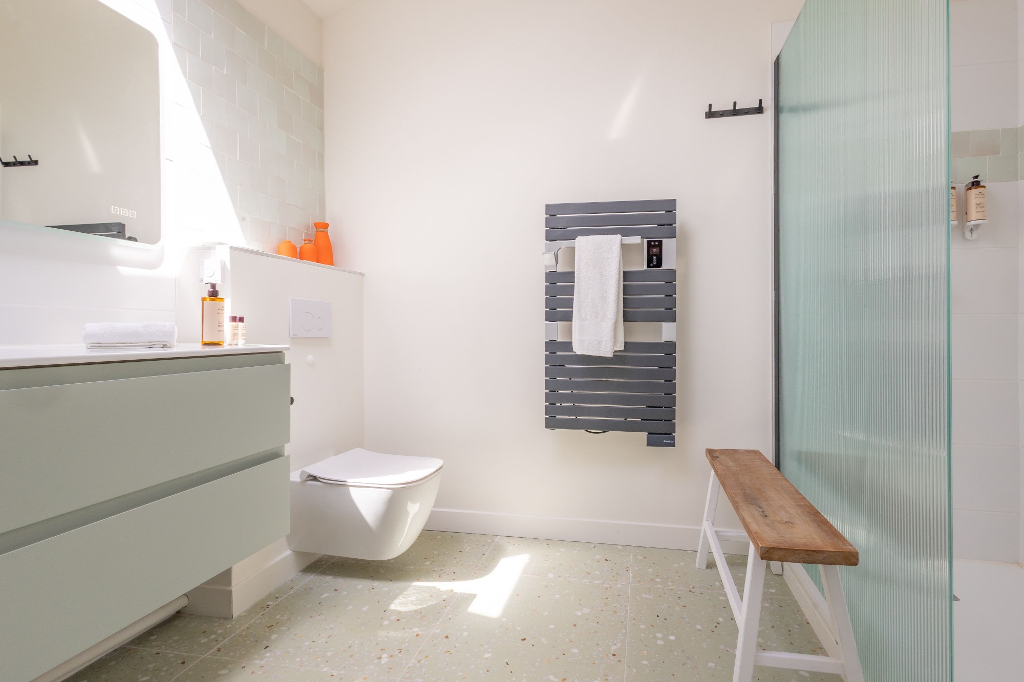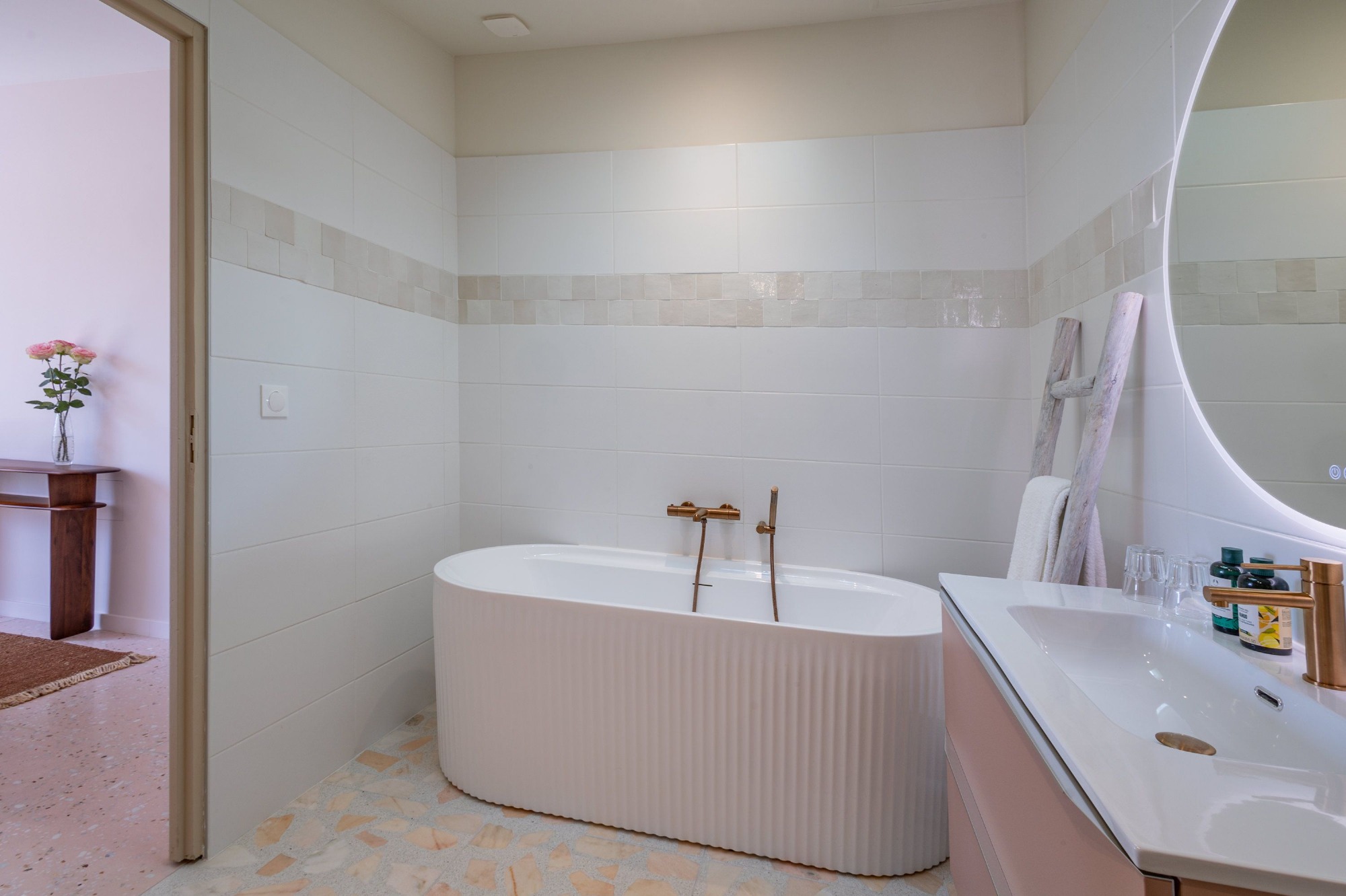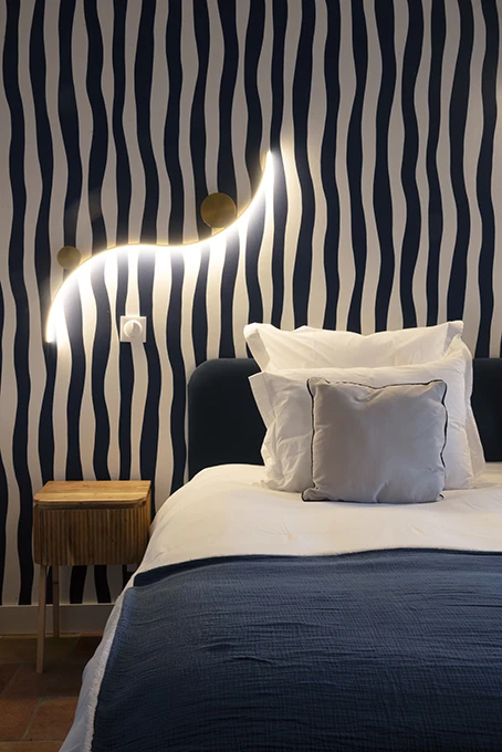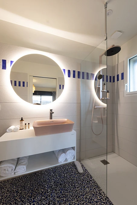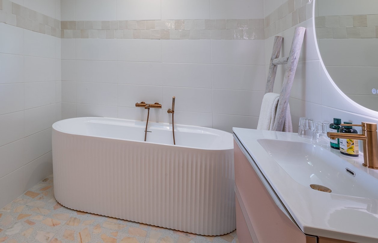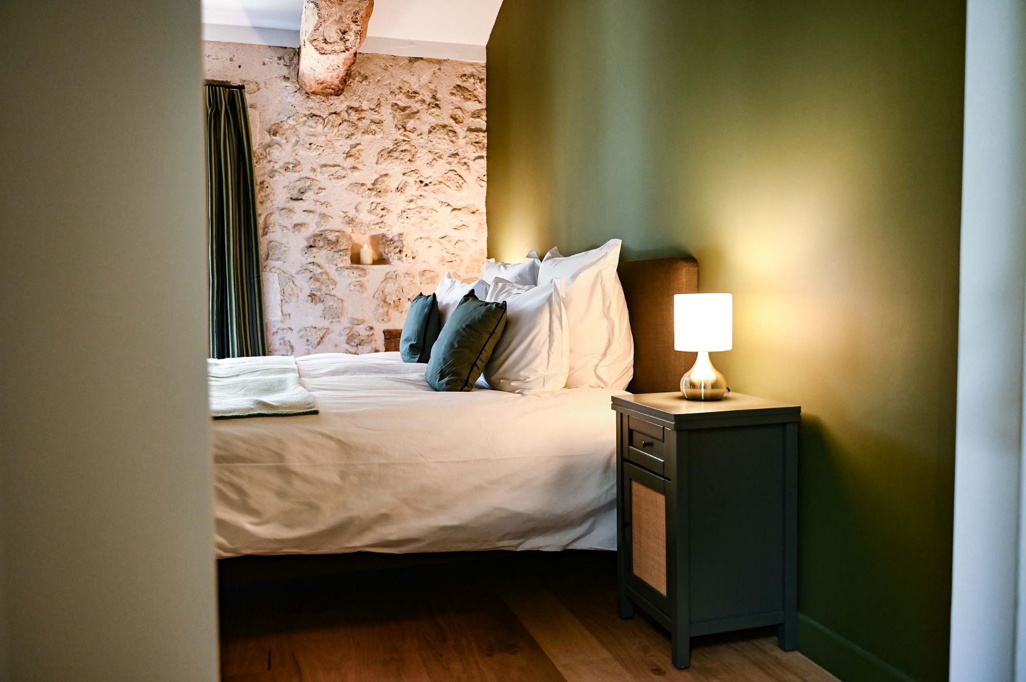 A quelques pas des deux maisons, la piscine a son univers propre avec son Pool bar (frigo, plaques à induction, évier, machine à café, verrerie sécurisée pour les extérieurs), sa pergola ornée de rideaux blancs qui dissimulent un lit de massage en plein air et ses chaises longues élégantes. Cafés du matin, déjeuner au soleil ou apéro au couchant, on s’attache facilement à cet endroit. Les serviettes de piscine sont bien entendu fournies.