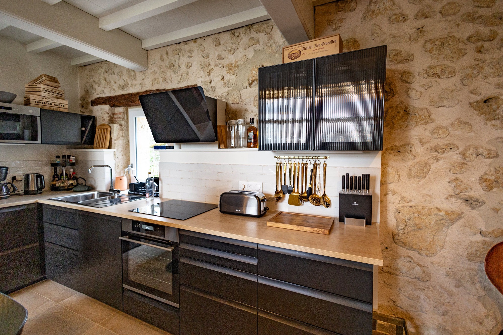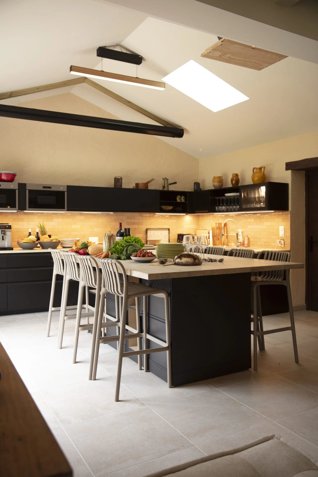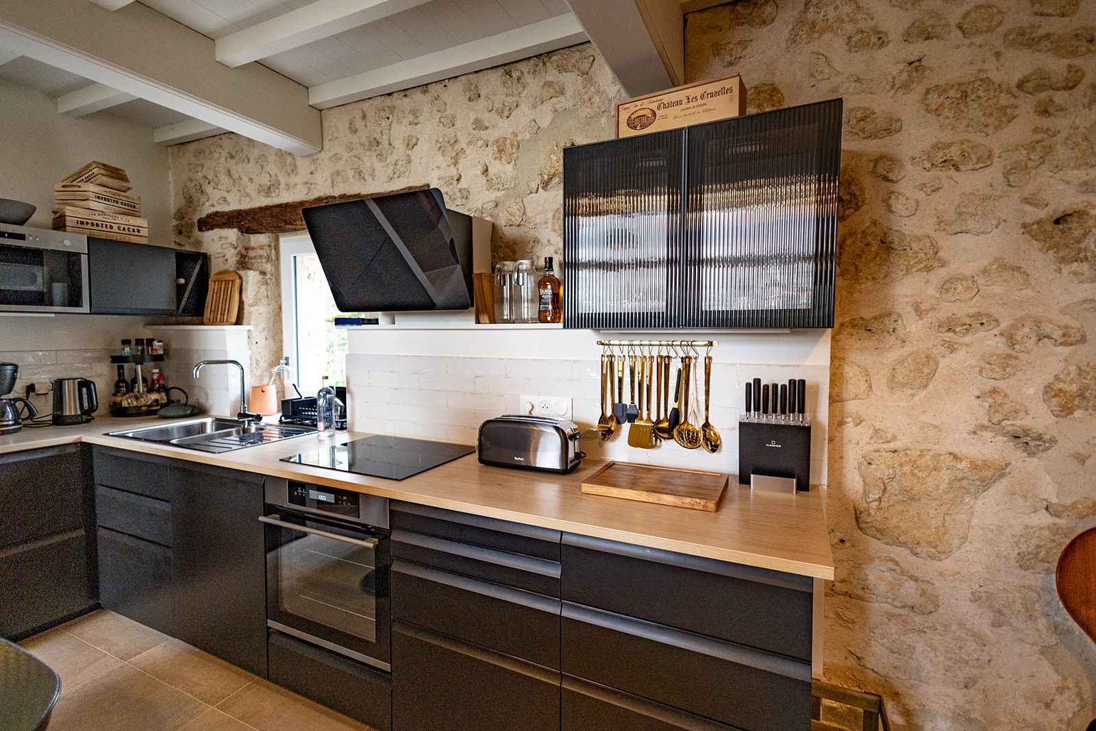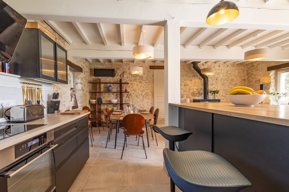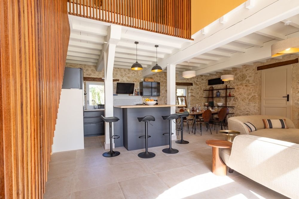La cuisine de la Villa, identique à celle du Mas… en plus imposante est agrémentée d'un îlot central amovible où peuvent s’attabler 12 convives. Le séjour est équipé d’un mobilier contemporain modulable pour des moments entre amis face au feu de cheminée ou pour regarder un film sur l’écran géant. Au rez-de-chaussée, une première chambre spacieuse avec salle de bain, wc, et sa terrasse privative. A l’étage la deuxième chambre, bénéficie aussi d’une vue fabuleuse sur la piscine et la campagne gersoise. Une literie premium vous attend pour un sommeil profond.