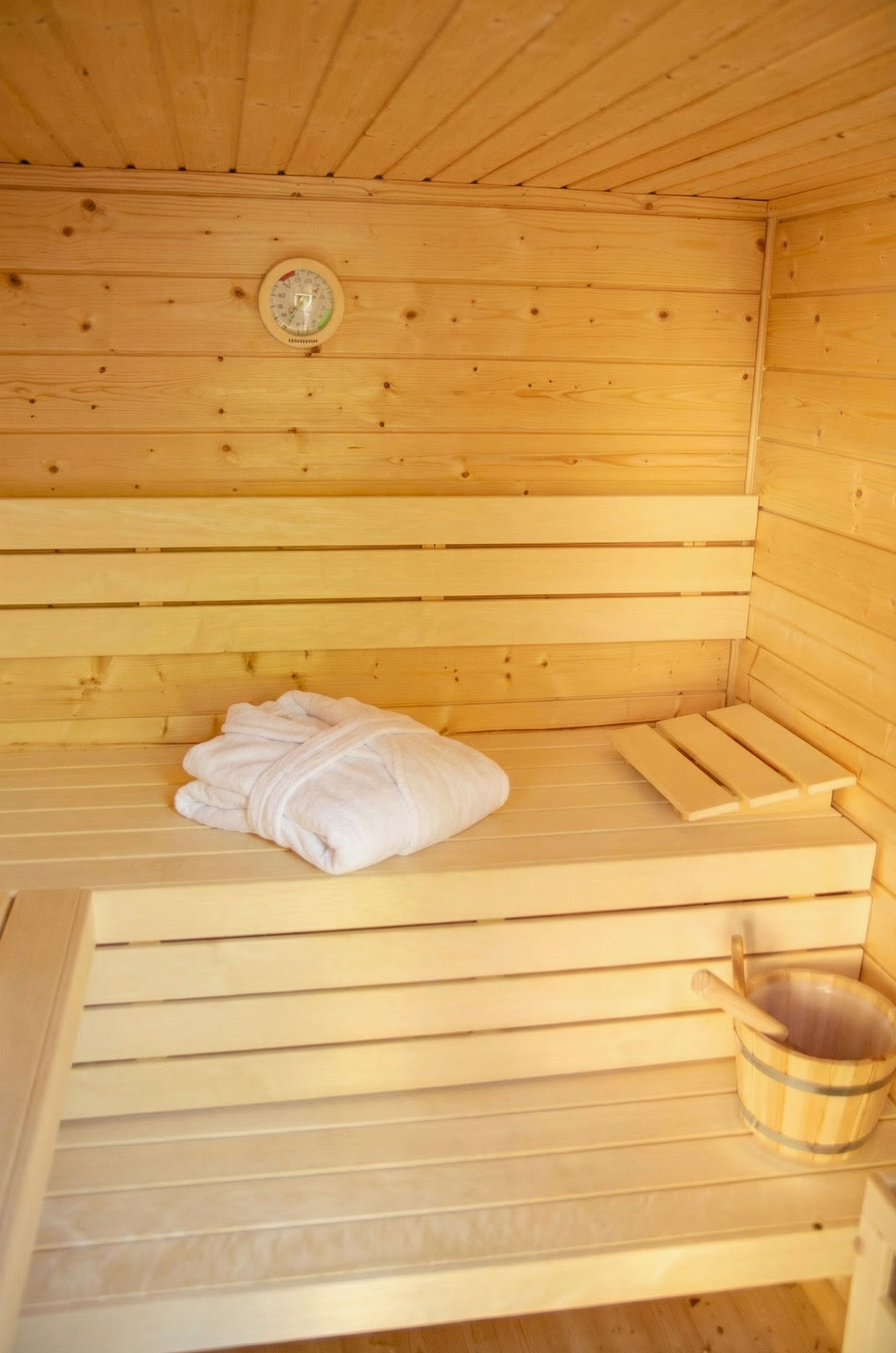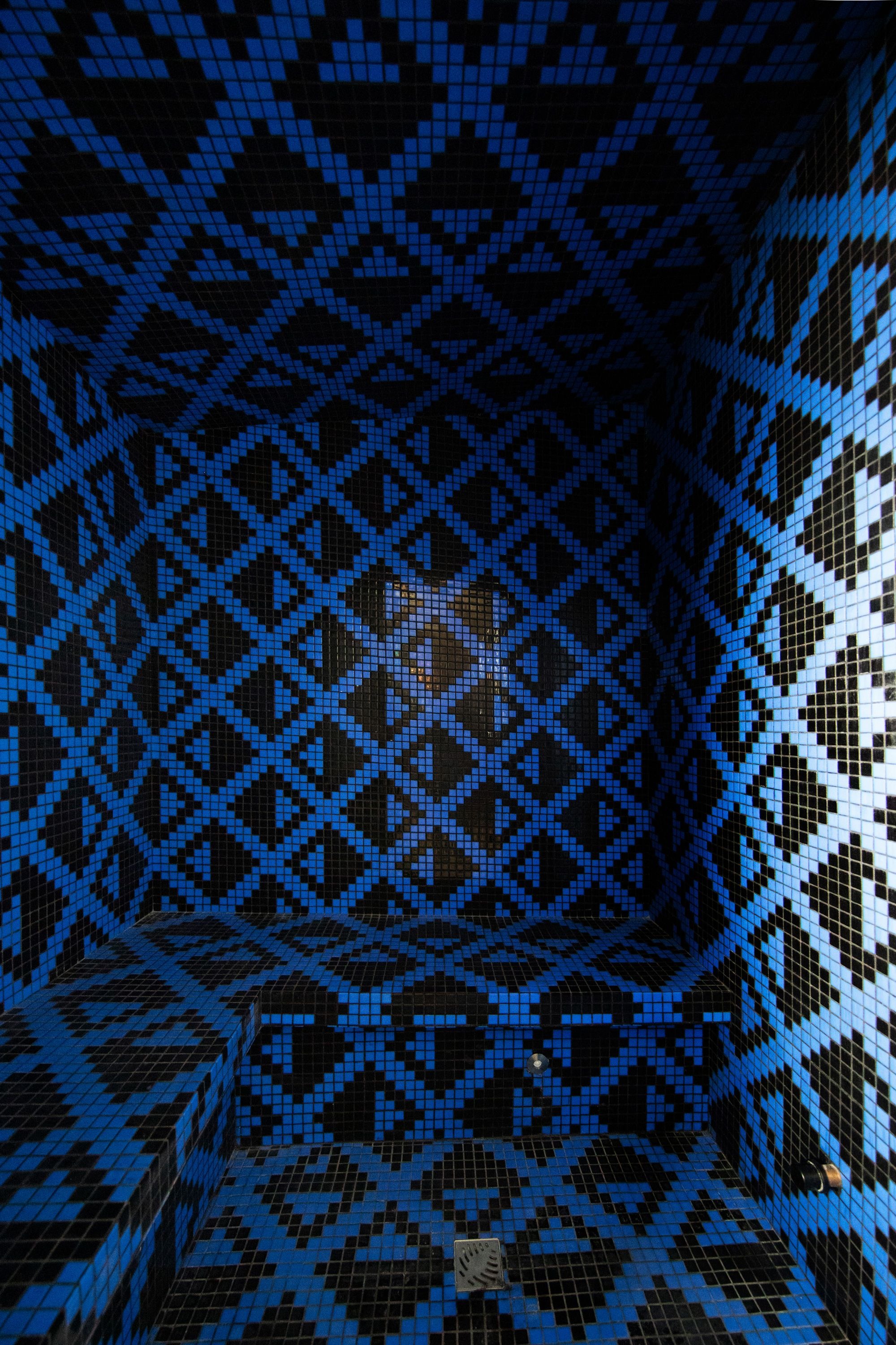 Le Hammam habillé d’une céramique bleue et noire est accessible directement depuis le séjour. Une douche est à disposition à proximité. Le Sauna se trouve sur la terrasse en face de l’entrée de la villa. Un coin repos est aménagé non loin.