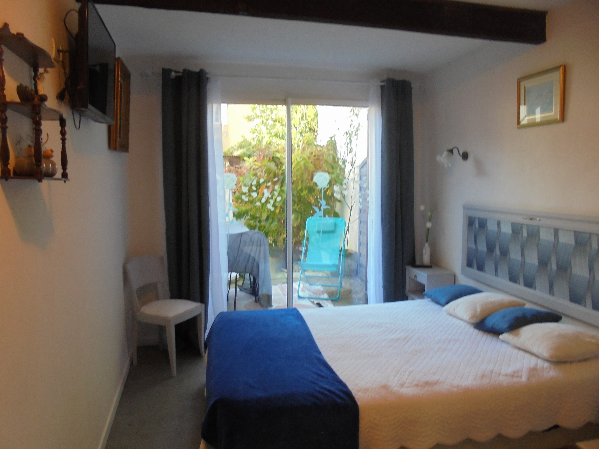 - d'une chambre donnant sur le patio, avec lit en 140 cm, dressing aménagé et TV