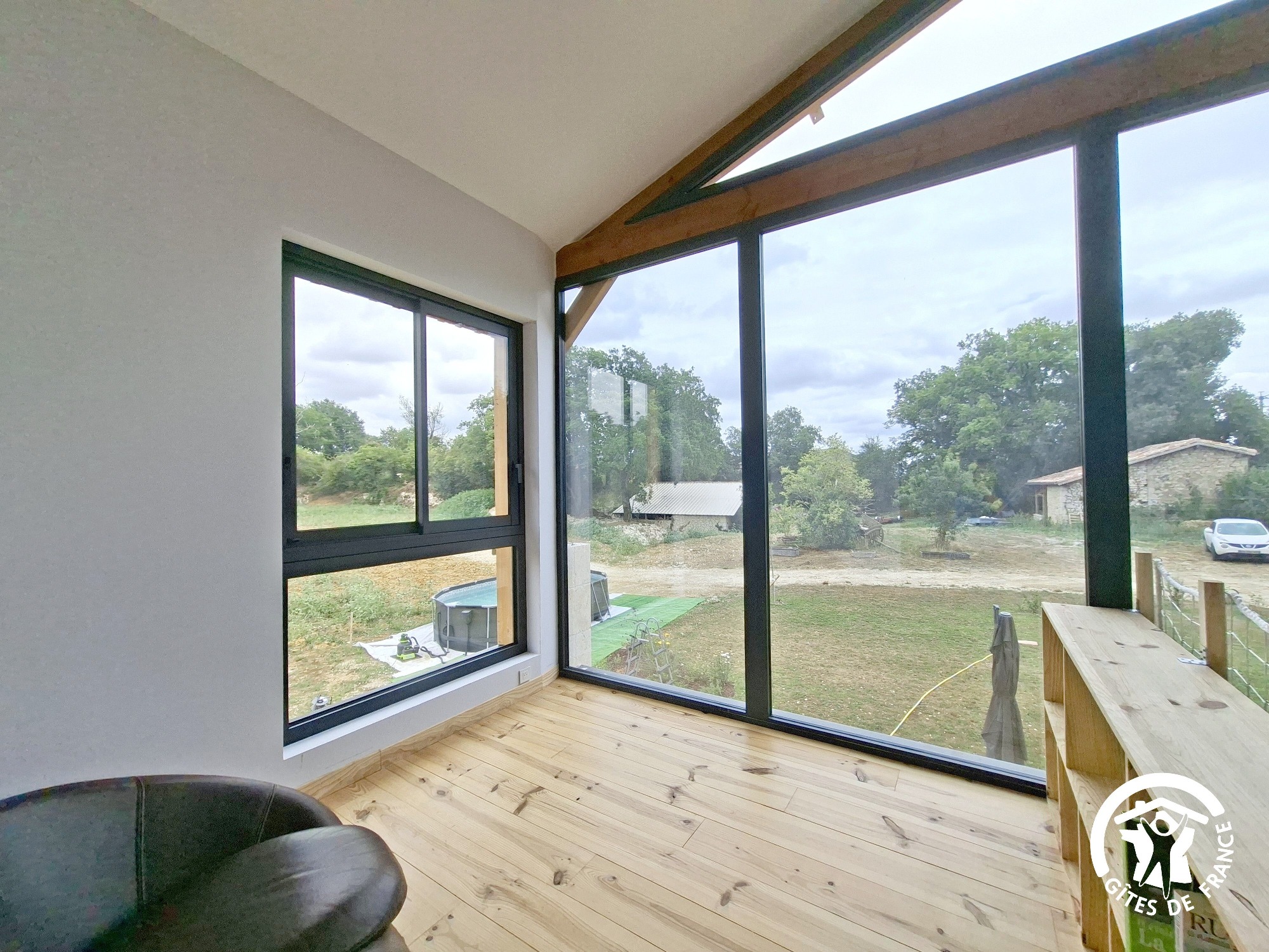 Cette maison lumineuse et spacieuse séduit dès l’arrivée par son architecture bois-pierre et ses immenses baies vitrées avec vue dégagée sur la campagne. Les grandes ouvertures laissent entrer la lumière tout en étant équipées de filtres solaires pour un confort optimal, complétés par une climatisation efficace.