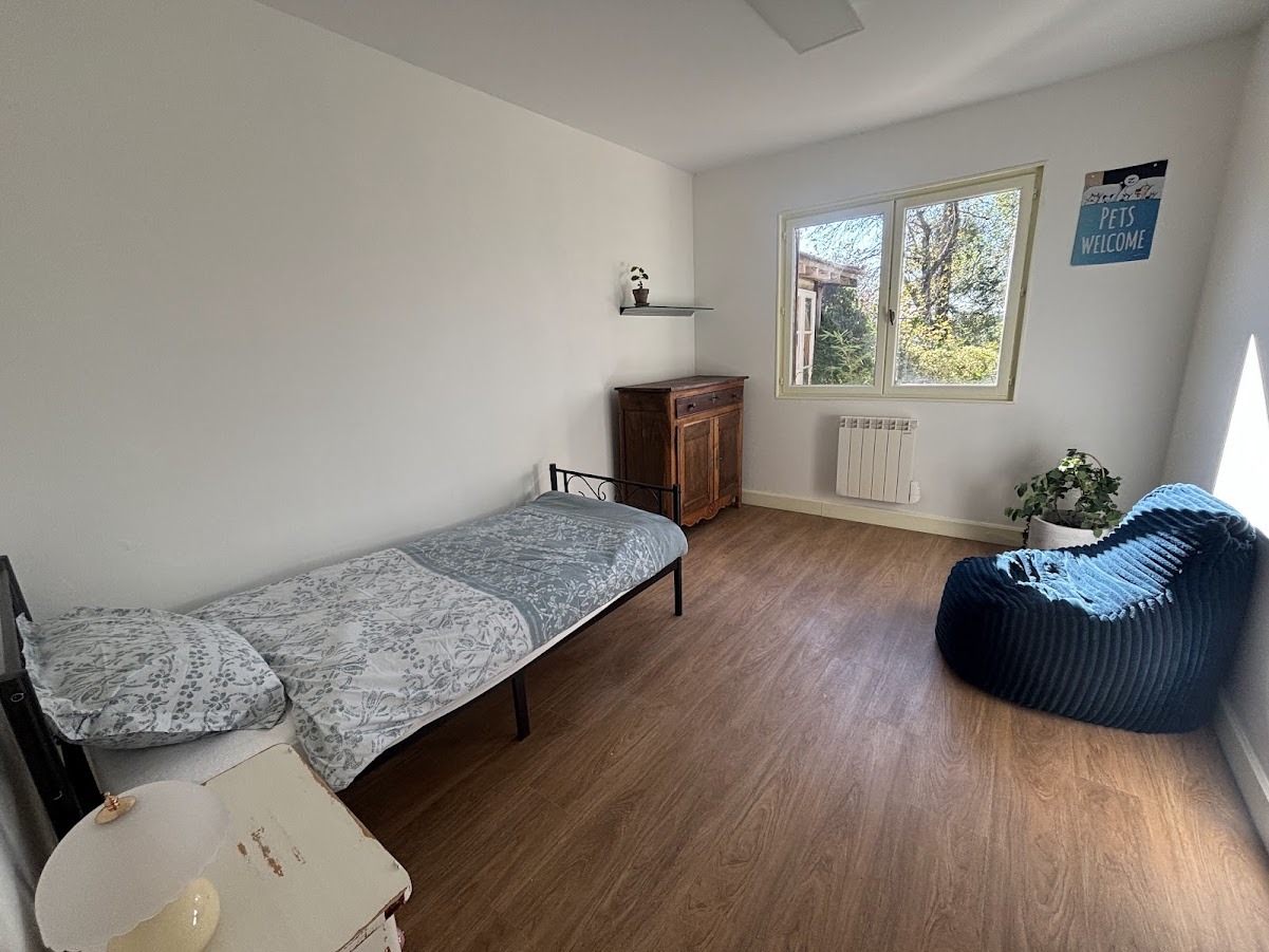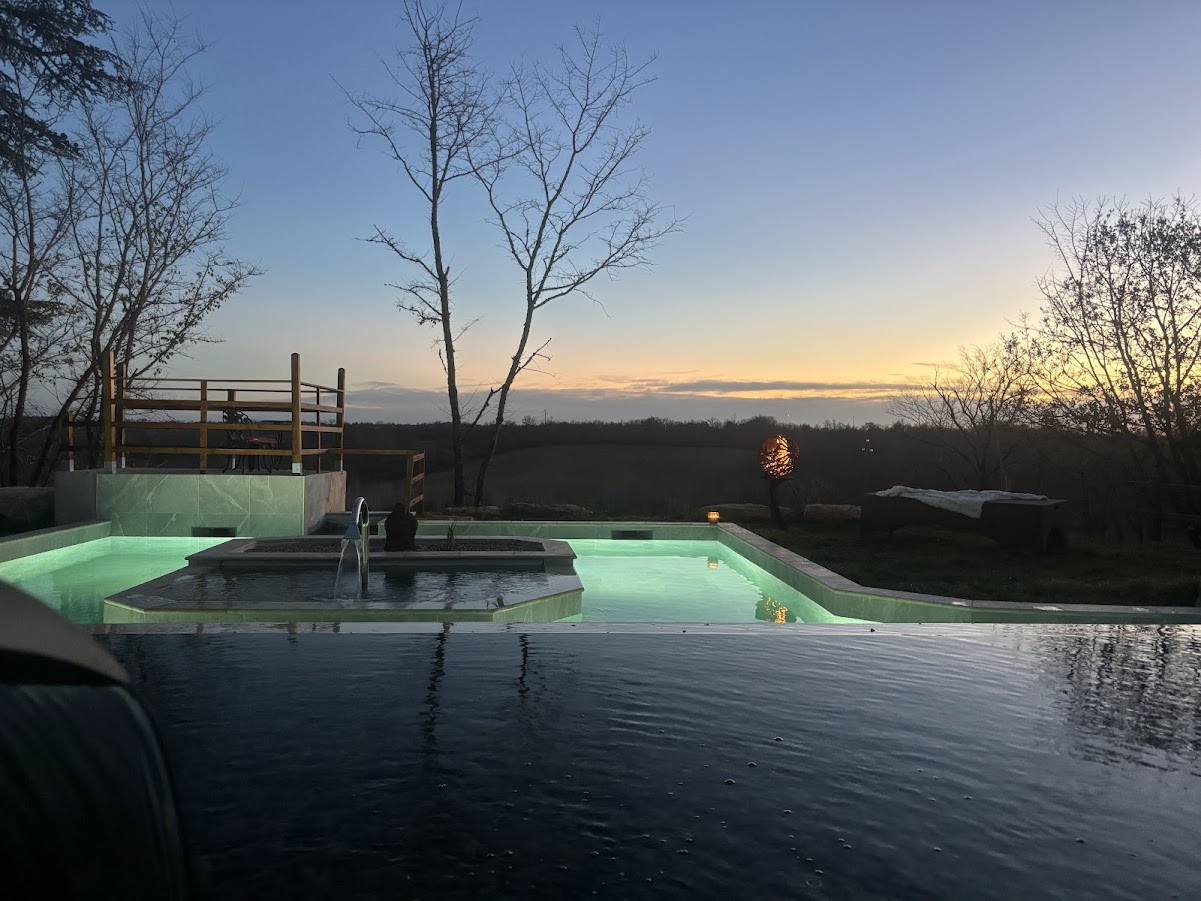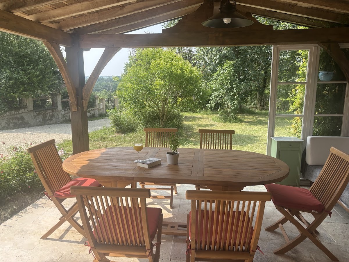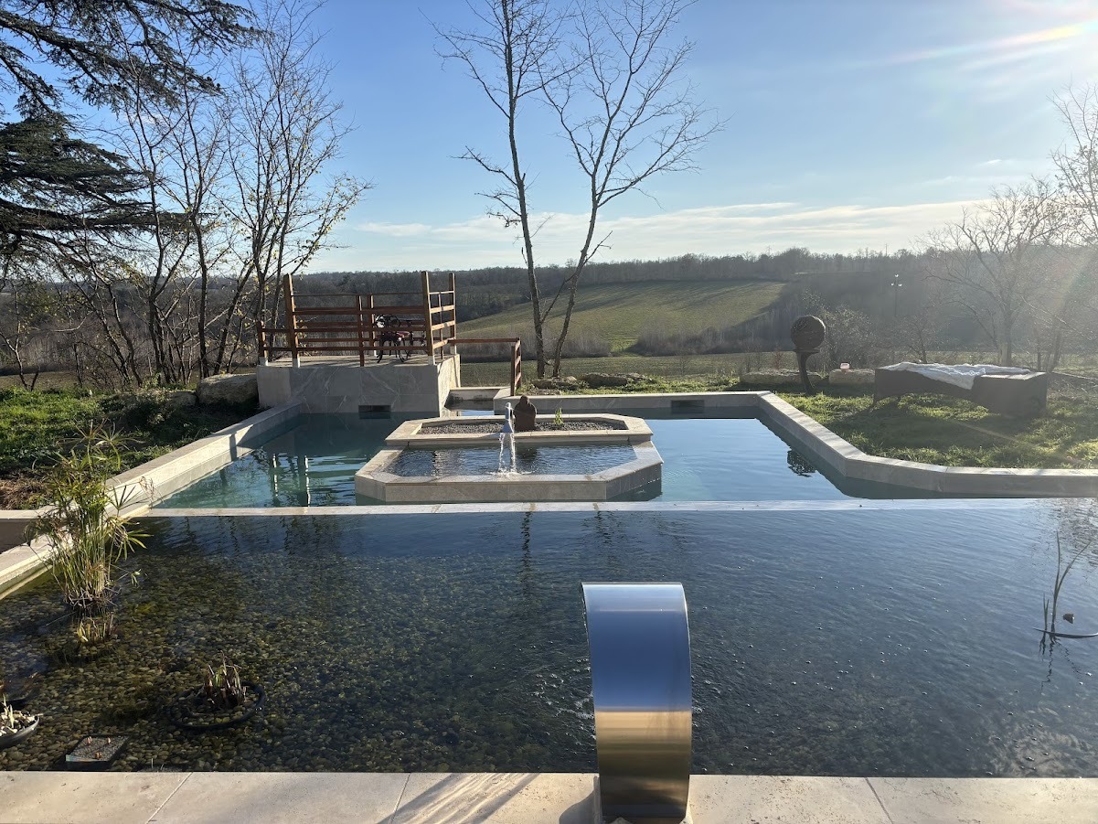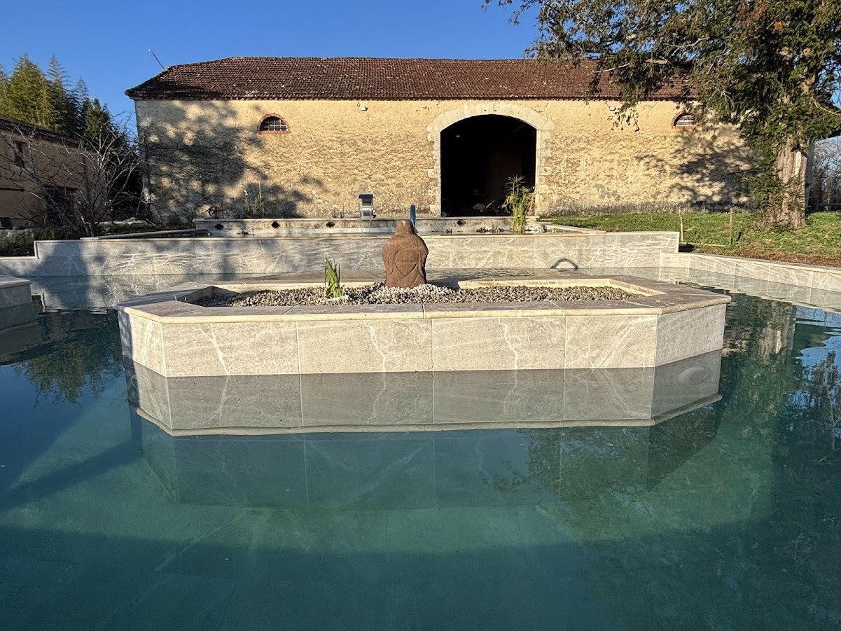 Il est situé entre l'étang et la maison. Un peu plus loin se trouve la piscine naturelle avec une vue magnifique sur les Pyrénées.