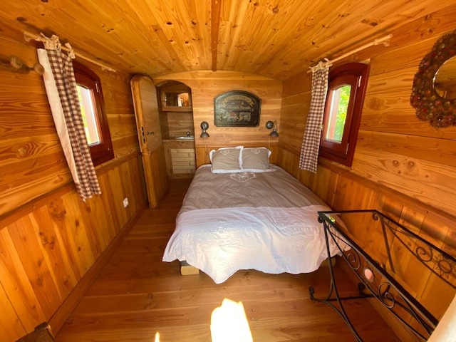 A l'intérieur vous trouverez avec une salle de bain et toilettes, un lit de 140 pour deux personnes.