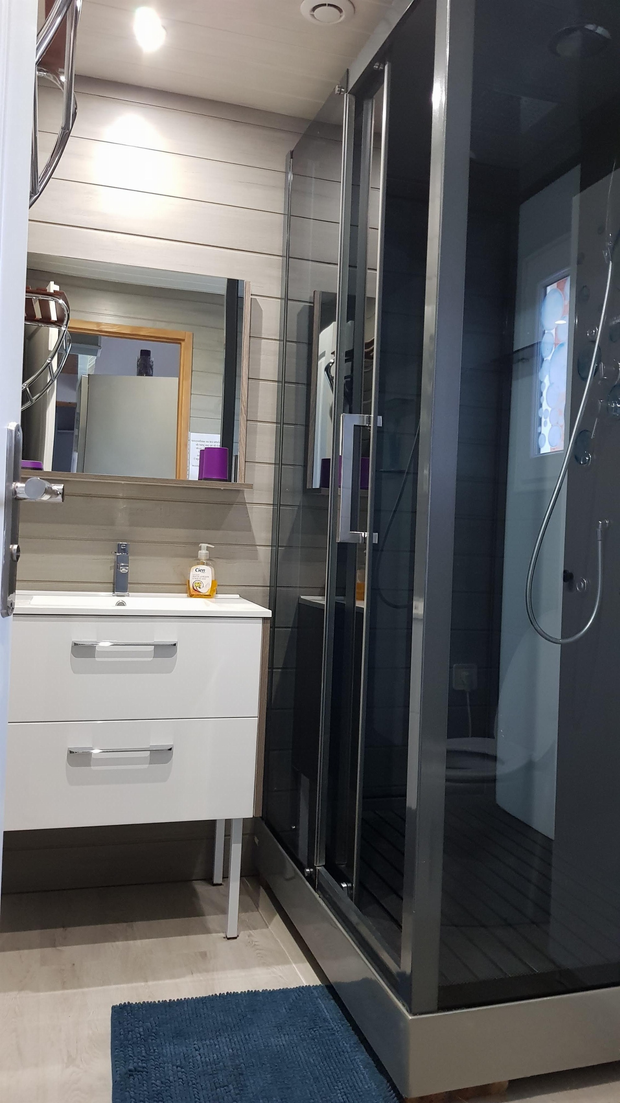 Vous profiterez également d’une salle de douche moderne et d’un terrain privatif de 100 m² avec barbecue. Un spa est accessible de mi-juin à fin septembre pour des moments de détente privilégiés.