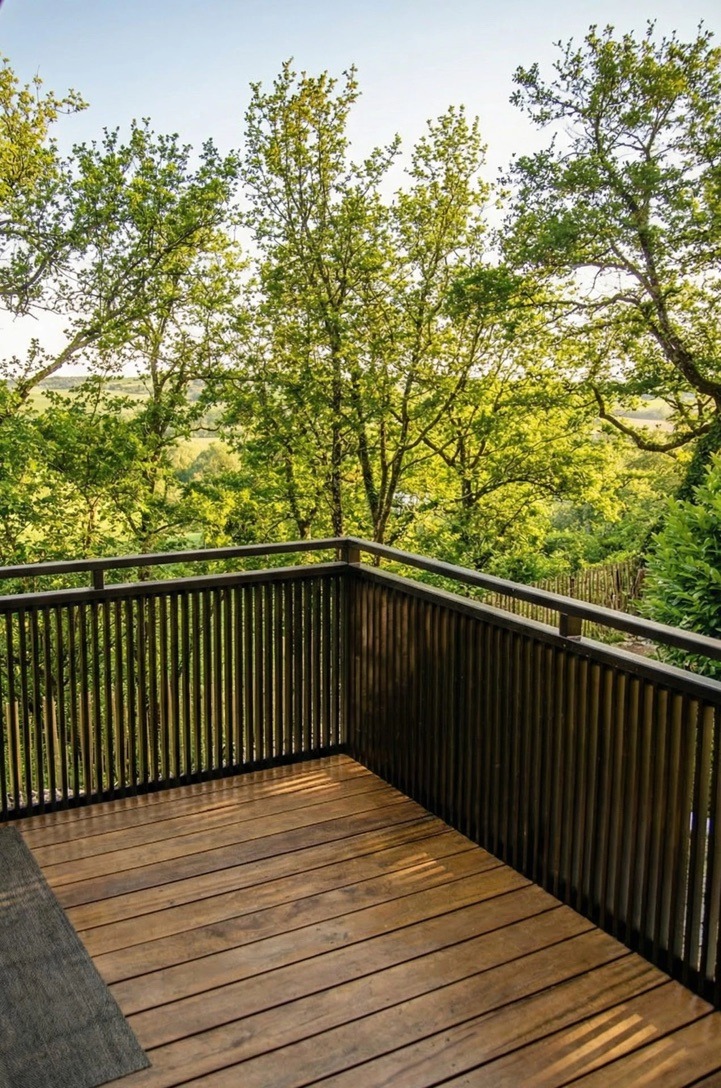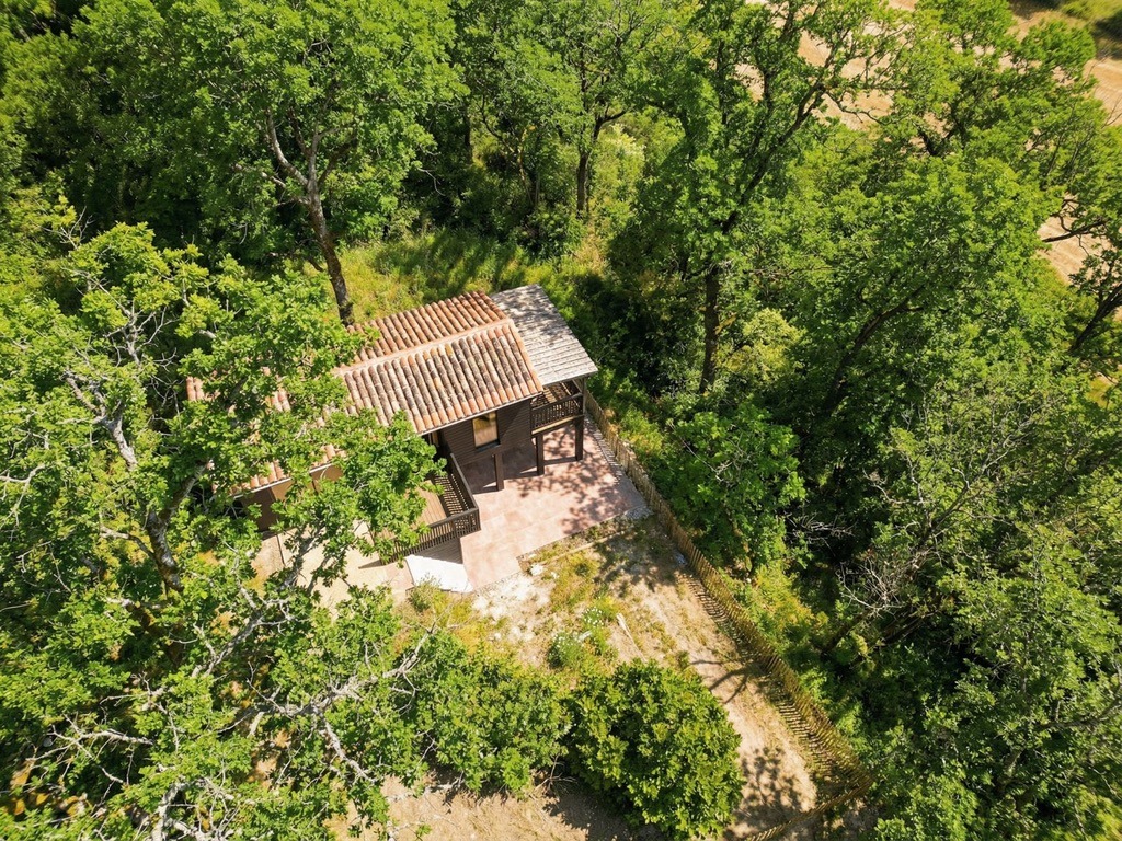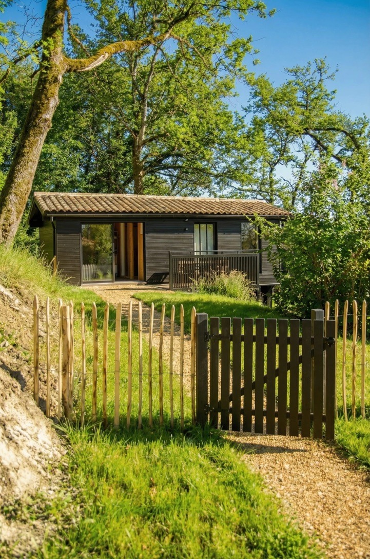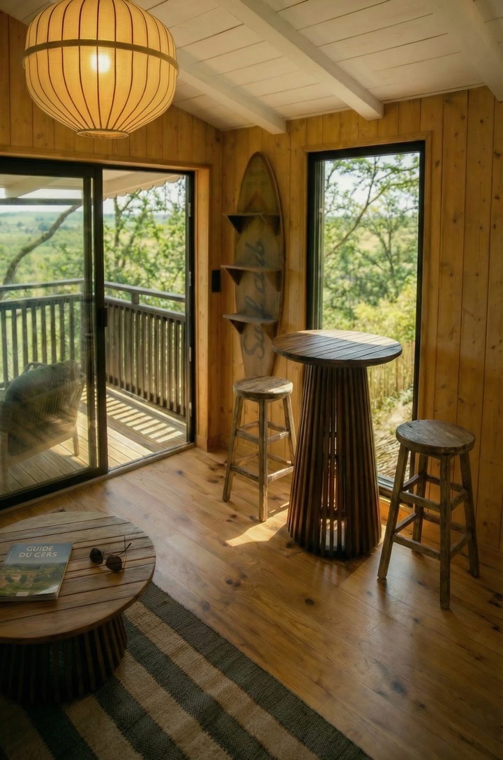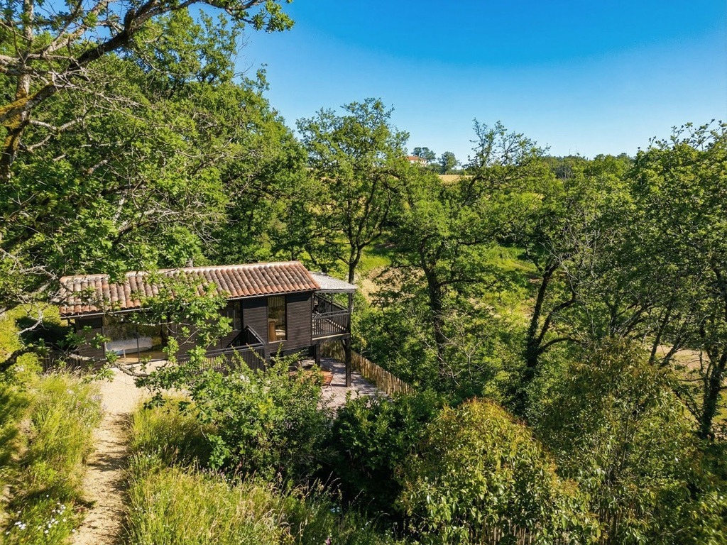 Au bout du domaine, perchée sur ses pilotis au milieu des arbres, la Tchanquée (du gascon chancat : fiché sur pilotis) est une retraite singulière pensée pour les amoureux. Son design raffiné, sa terrasse suspendue, sa vue exceptionnelle et le calme environnant créent une expérience rare, hors du temps, où l’on vient se reconnecter à l’essentiel.