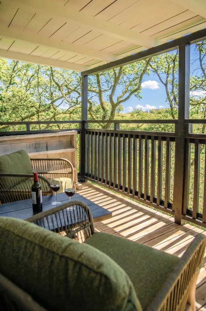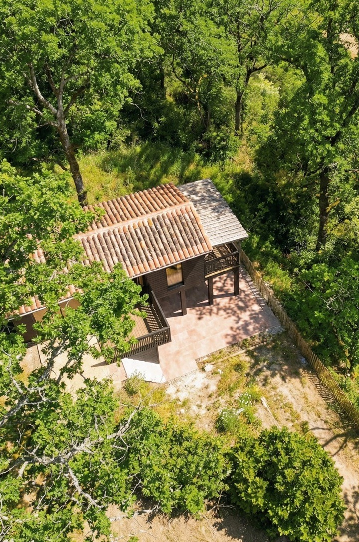 À l’extérieur, deux terrasses prolongent l’expérience : l’une, dans la continuité du séjour est le lieu idéal pour savourer un apéritif face à la nature. L’autre, sous la cabane invite au repos avec ses deux hamacs.