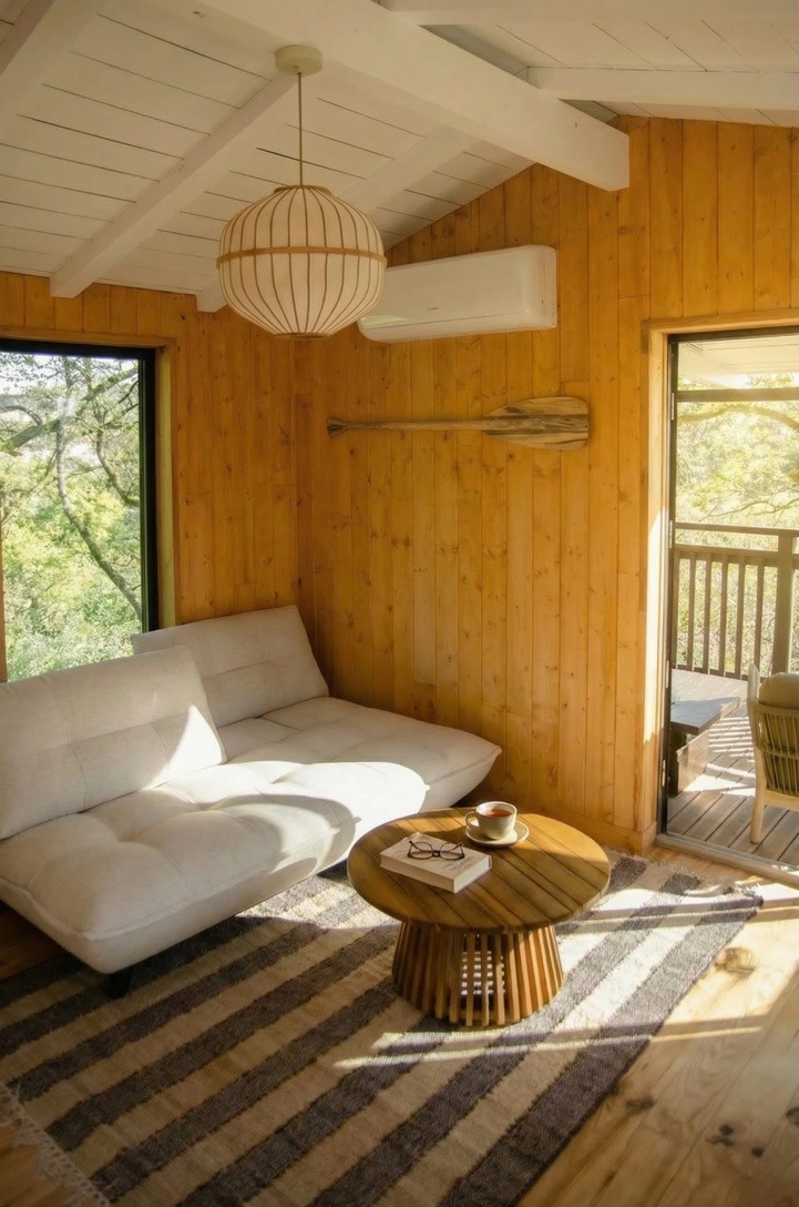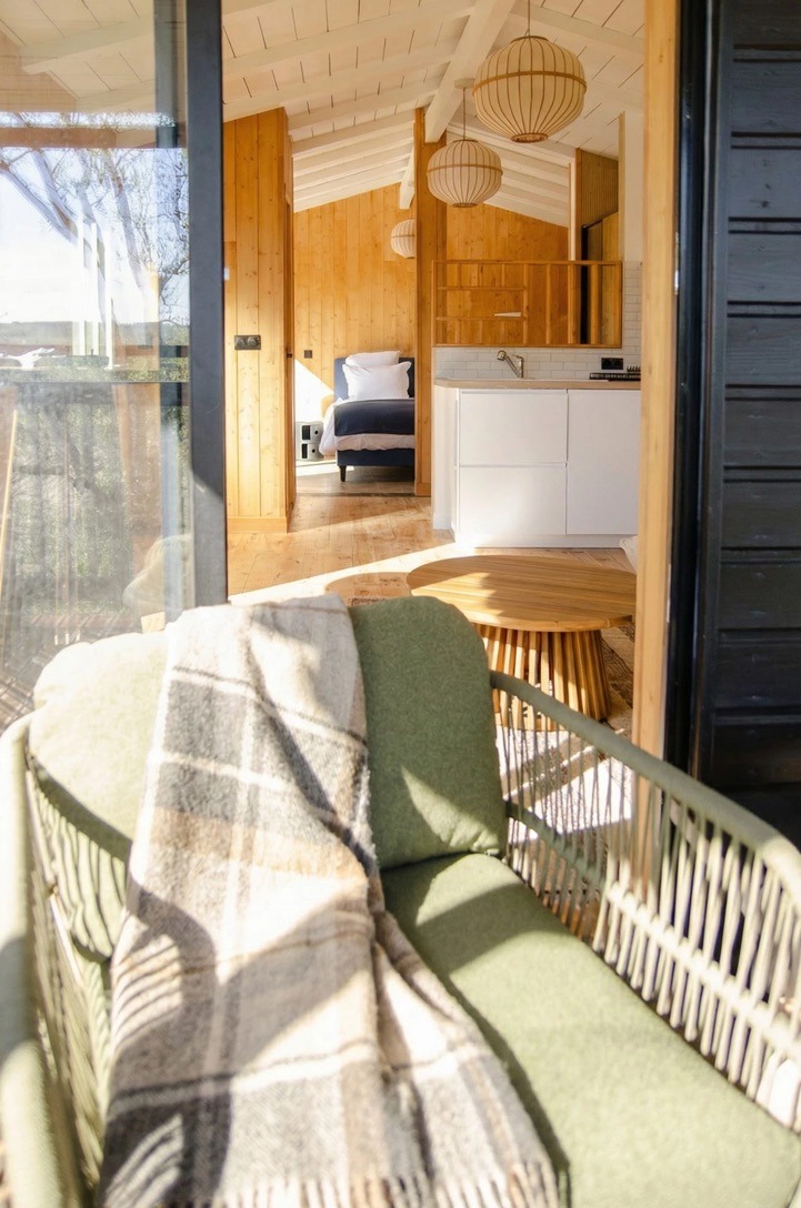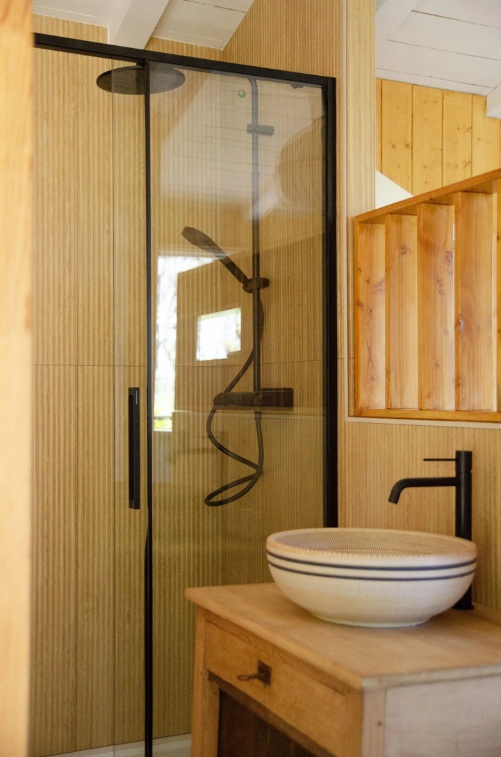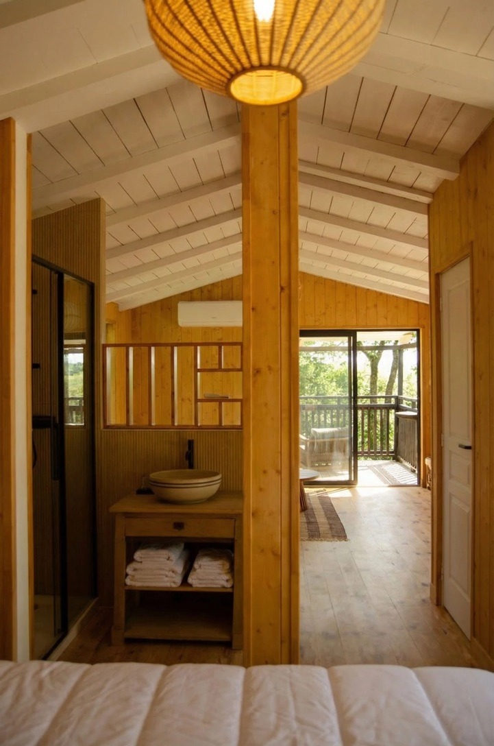 La cabane de 30 m2 (hors terrasses), est très lumineuse grâce à ses nombreuses ouvertures. Tout en bois, elle est conçue sans cloison (à l’exception des toilettes), de manière à pouvoir admirer la nature et la vue depuis la chambre.