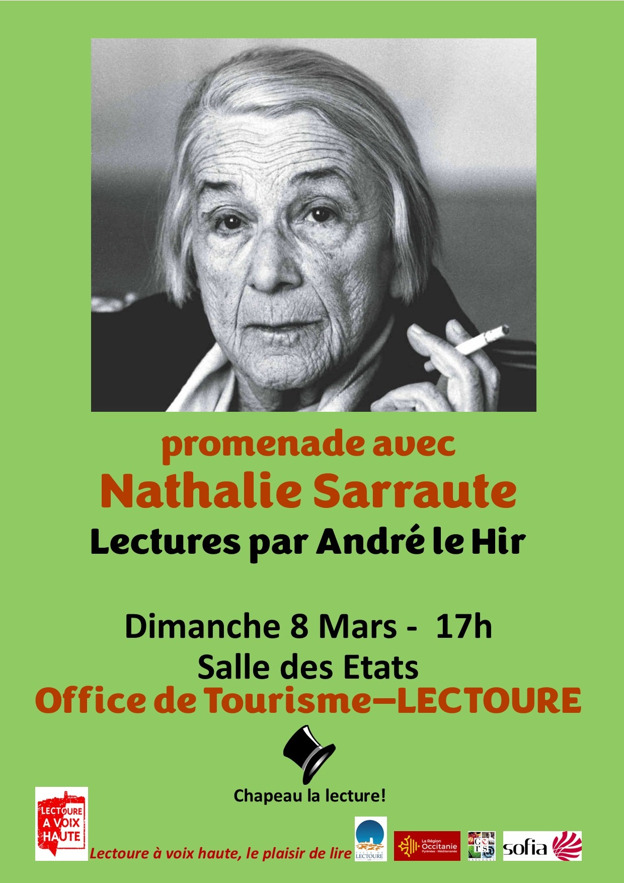 Promenade avec Nathalie Sarraute, lectures par André Le Hir. Le dimanche 8 Mars à 17h dans la salle des états de l'Office de Tourisme à Lectoure. Organisé par "Lectoure à voix haute", le plaisir de lire !