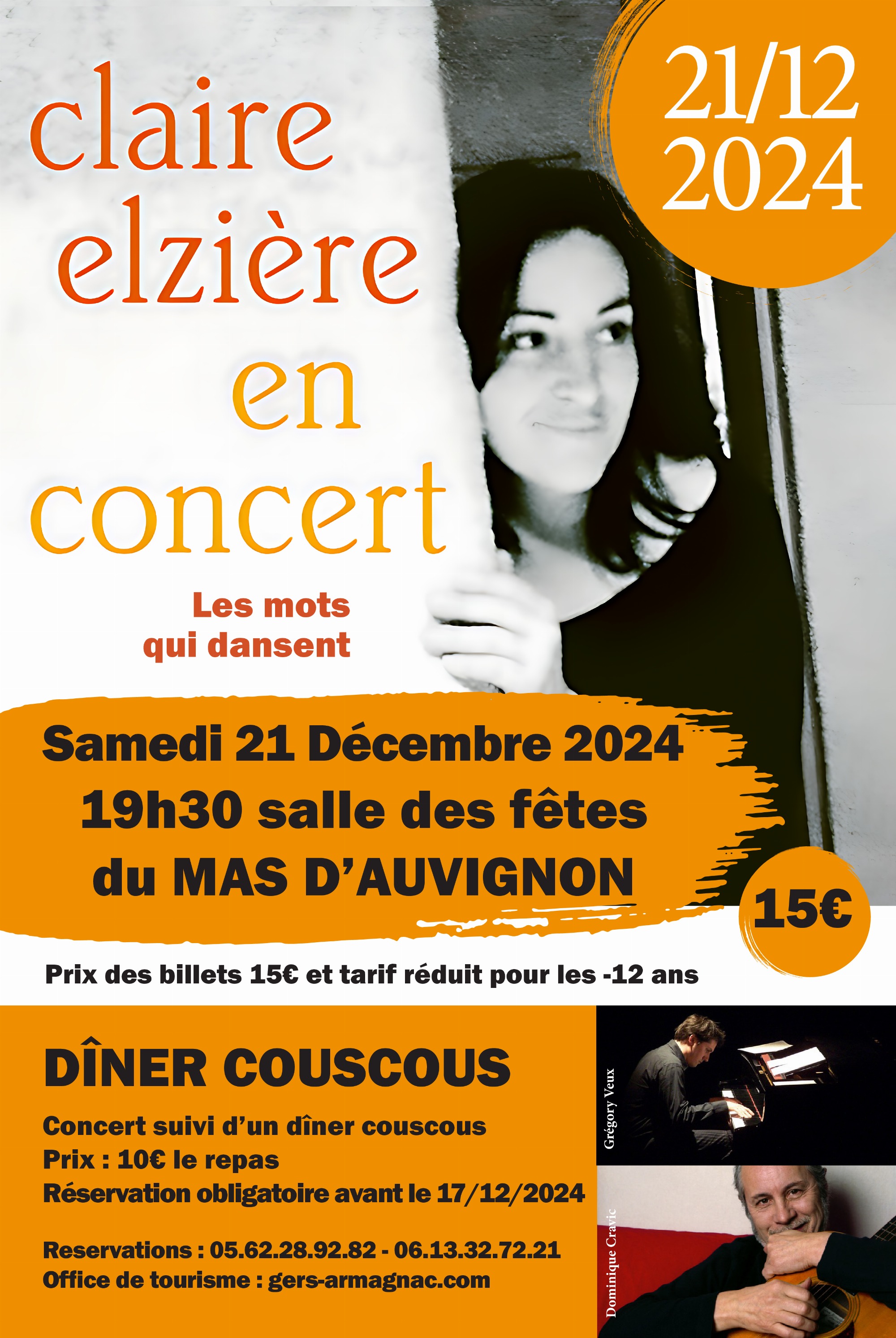 REPAS + CONCERT ICI : https://www.gers-armagnac.com/vivre/agenda/billetterie/7163741_repas-et-concert-de-claire-elziere/