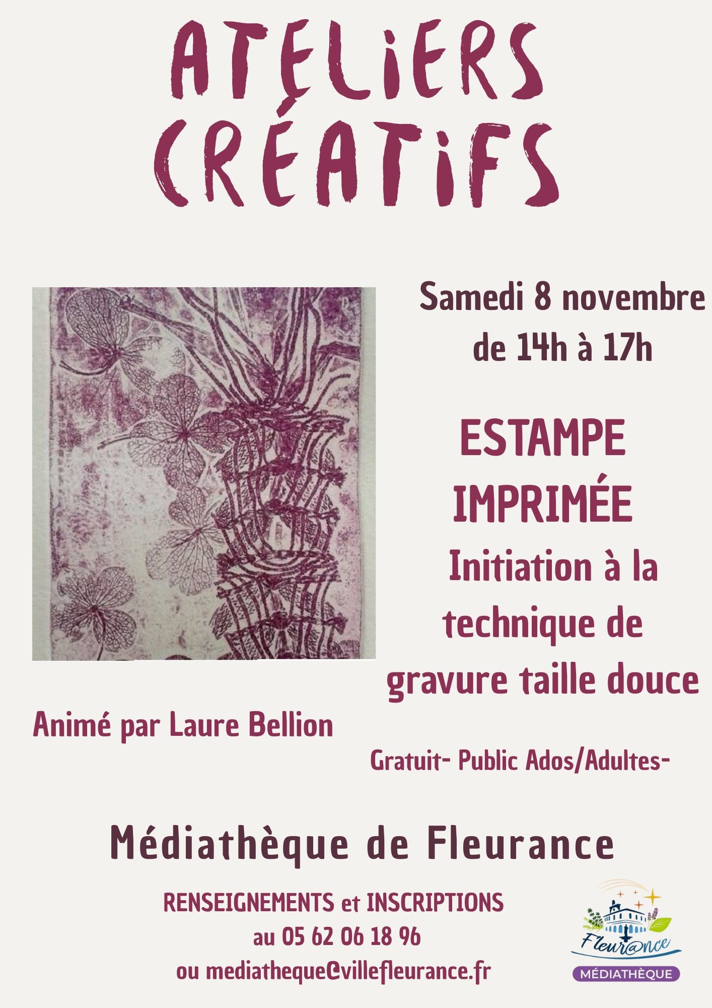 Laure Bellion vous invite à venir découvrir l'art de l'estampe imprimée grâce à la gravure sur vernis "mou" et presse taille-douce.