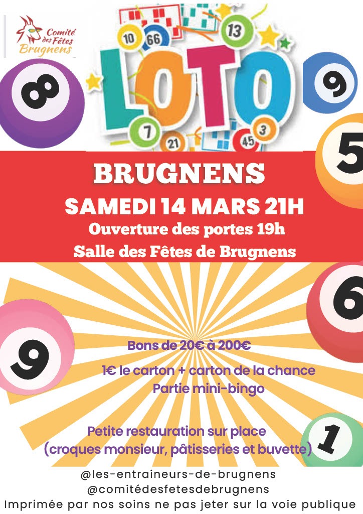 Préparez-vous à passer un super moment de convivialité et de bonne humeur au loto du comité des fêtes de Brugnens !