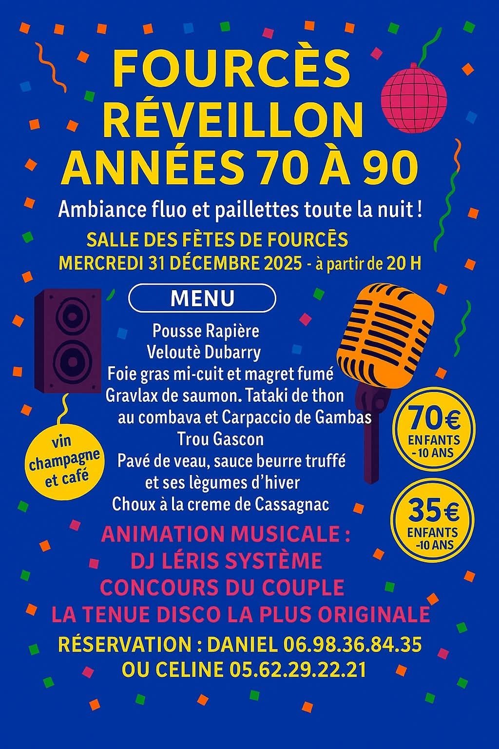 Pour le réveillon à Fourcès ce sera Ambiance Année 70 à 90. Rendez-vous à la salle des fêtes à partir de 20h.