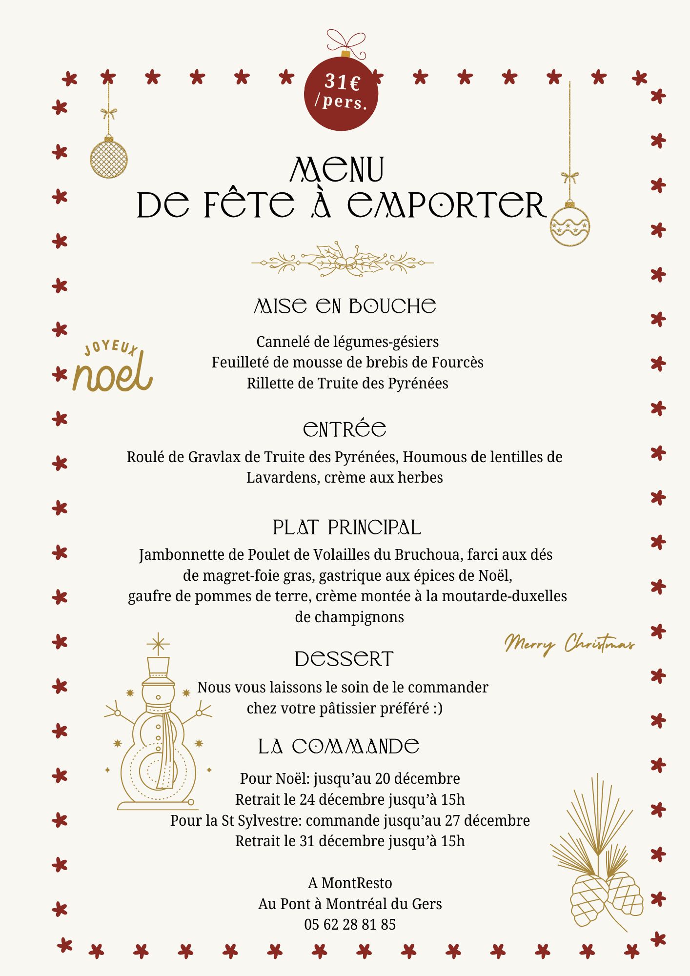Commande jusqu'au 27 décembre pour repas du 31 décembre à retirer le 31 jusqu'à 15h.