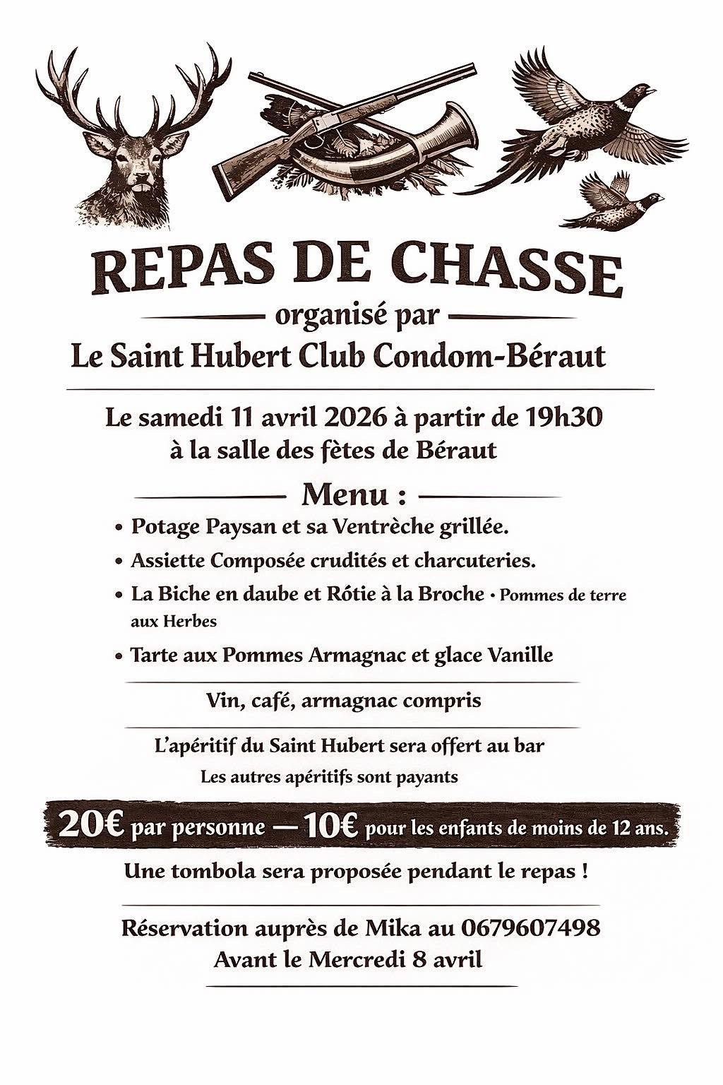 Repas organisé par le St Hubert Club de Condom/Béraut, à la salle des fêtes dès 19h30.