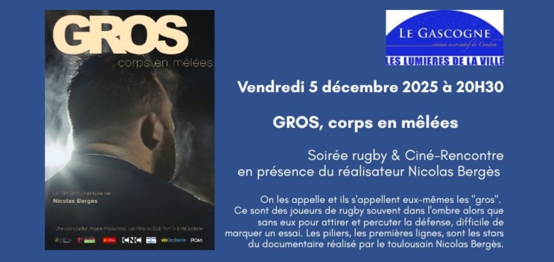 Le Gascogne propose cette soirée à 20h30 : avec la projection de GROS, corps en mêlées en présence du réalisateur, Nicolas Bergès.