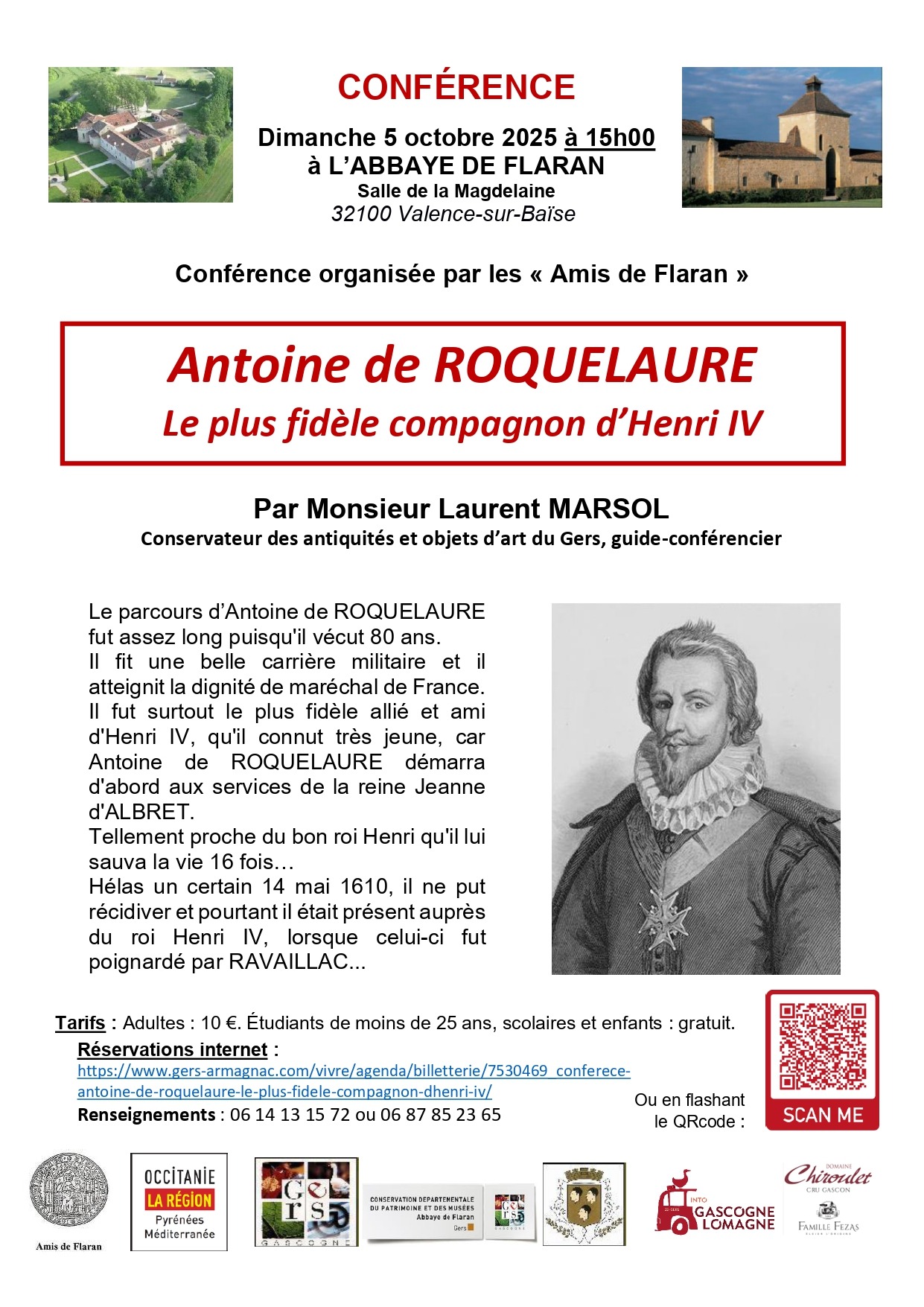 Rendez-vous à 15h00, dans la salle Magdaleine de l'Abbaye de Flaran pour une conférence sur Antoine de Roquelaure, le plus fidèle compagnon d'Henri IV.