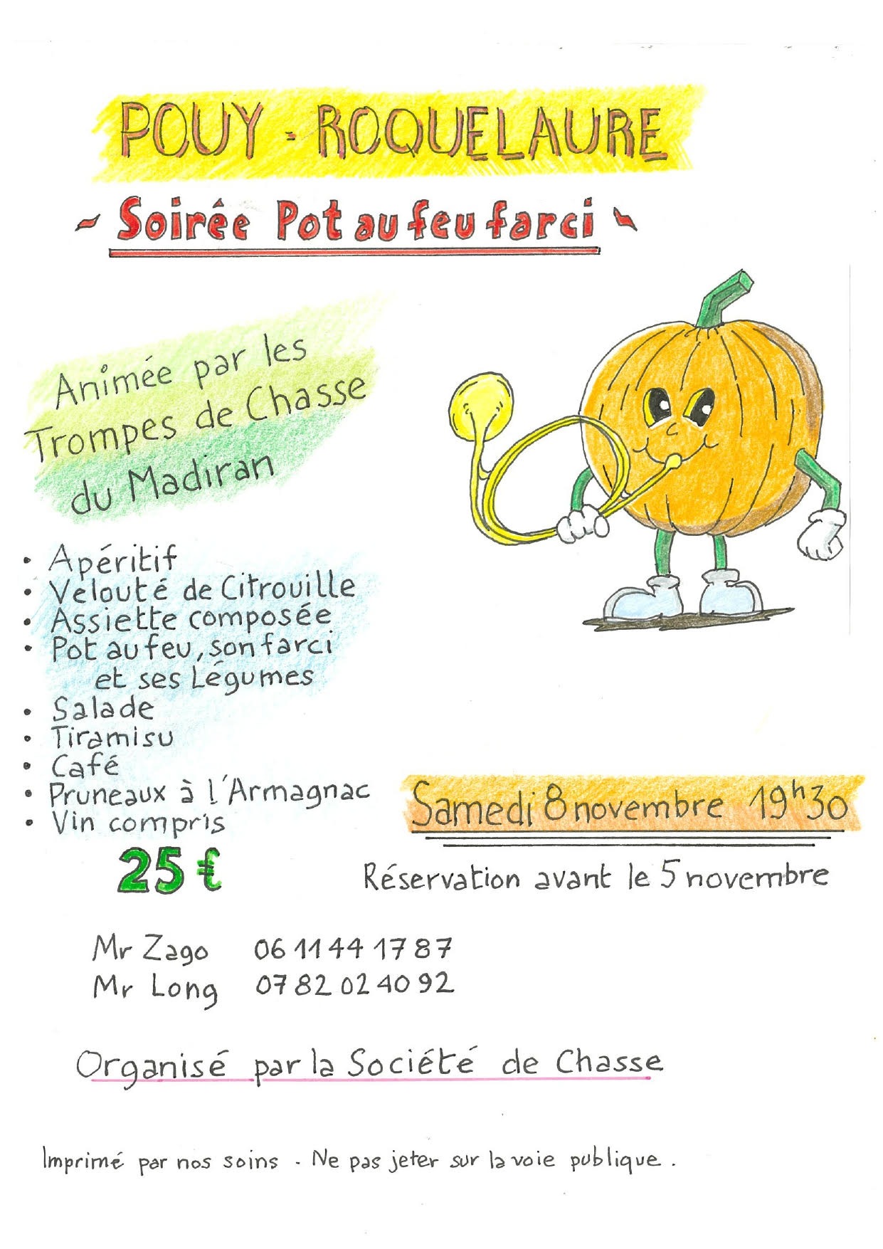 La société de chasse de Pouy-Roquelaure vous invite à partager un moment convivial autour d’un pot-au-feu farci, le samedi 8 novembre à 19h30, à la salle des fêtes de Pouy-Roquelaure. Soirée animée par les Troupes de chasse du Madiran