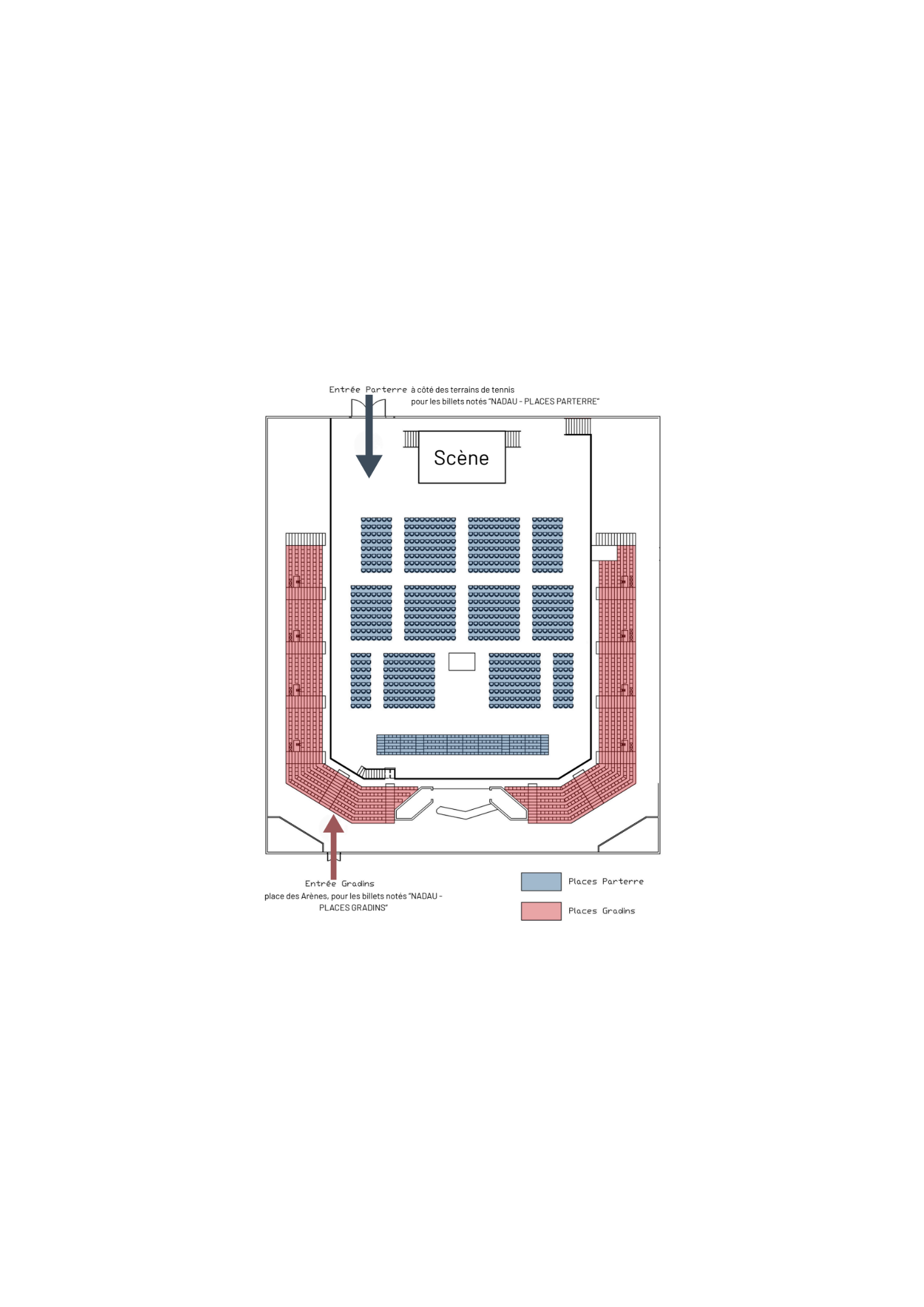 Places en parterre (chaises) : l’entrée se fera par le bas de salle, au niveau des terrains de tennis.