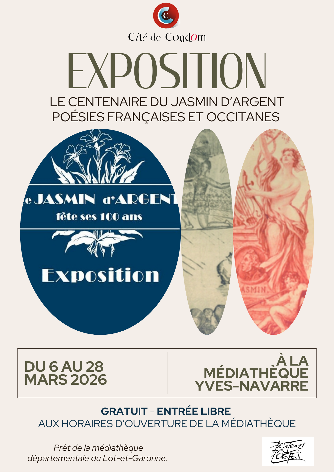 Du 6 au 28 mars, venez découvrir l'exposition « Le centenaire du Jasmin d’Argent - poésies françaises et occitanes » à la médiathèque de Condom !