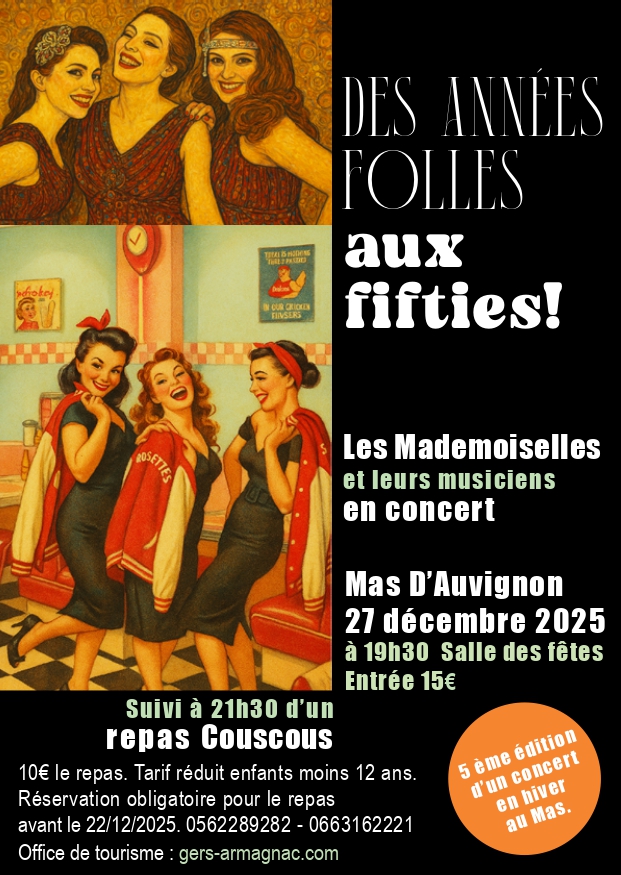 Suivi à 21h30 d’un repas Couscous. 10€ le repas. Tarif réduit enfants moins 12 ans. Réservation obligatoire pour le repas avant le 22/12/2025. 0562289282 - 0663162221