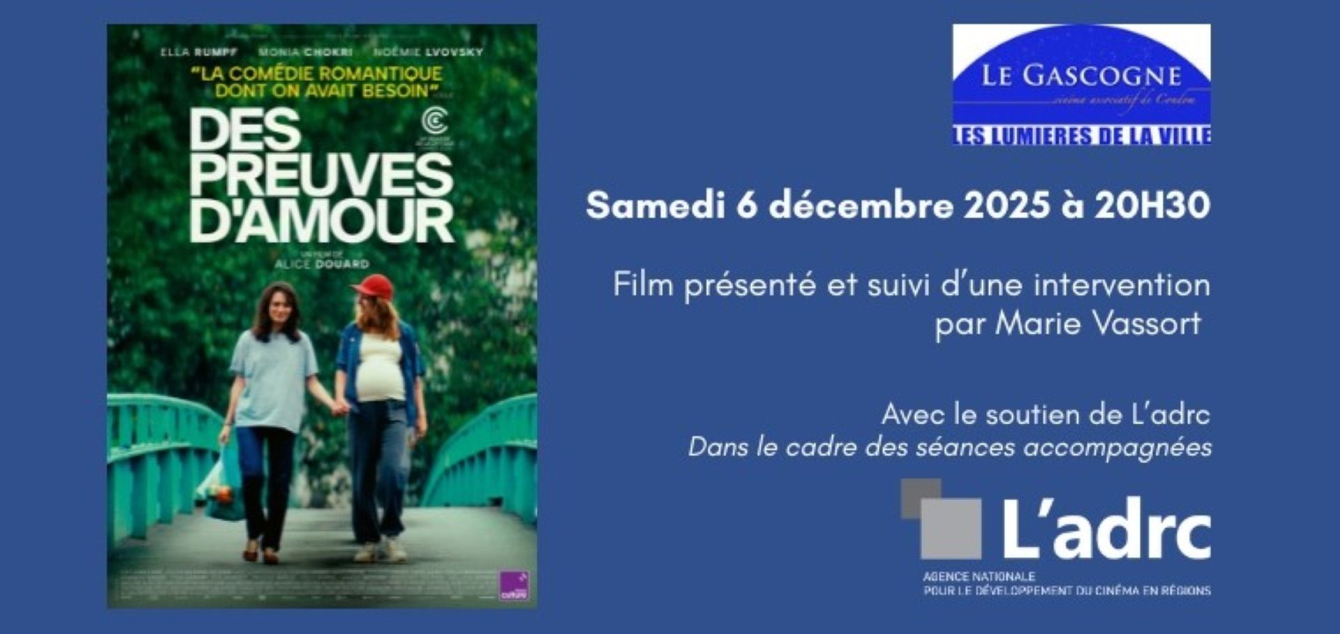 Le Gascogne propose cette soirée avec le soutien de l'ADRC (Agence nationale pour le développement du cinéma en régions) , avec la projection de " Des preuves d'amour " à 20h30.