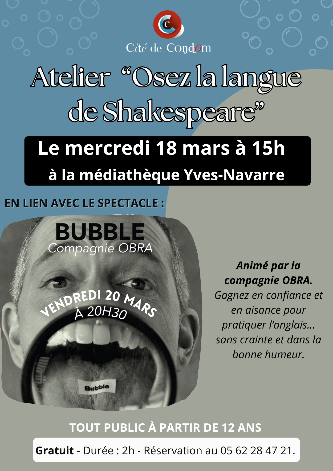 Atelier « Osez la langue de Shakespeare » à la médiathèque animé par la compagnie OBRA à 15h le 18 mars !