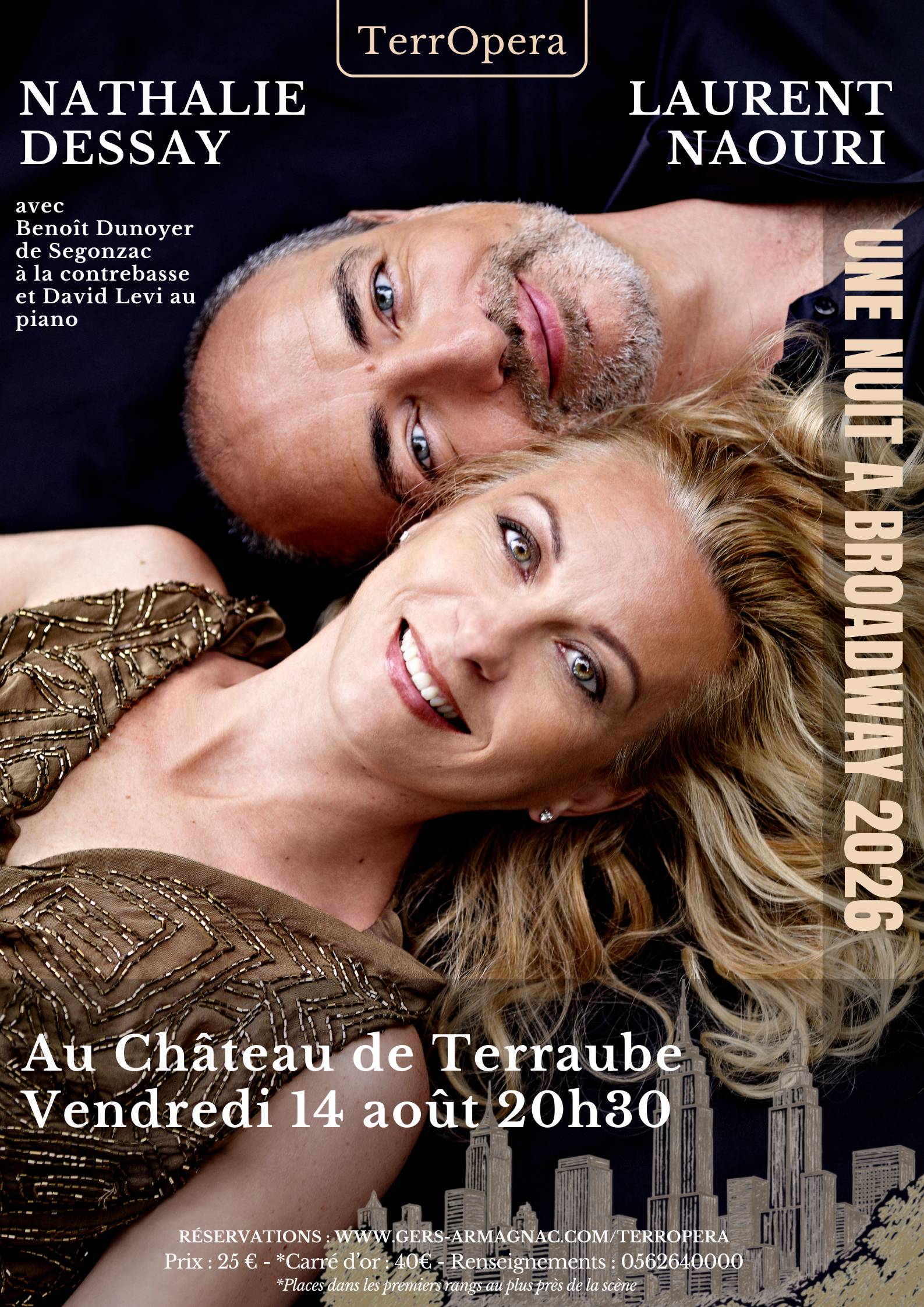 Terropera présente : Une Nuit à Broadway 2026 exceptionnelle avec Nathalie Dessay et Laurent Naouri, accompagné de Benoit Dunoyer de Segonzac à la contrebasse et David Levi au piano.
