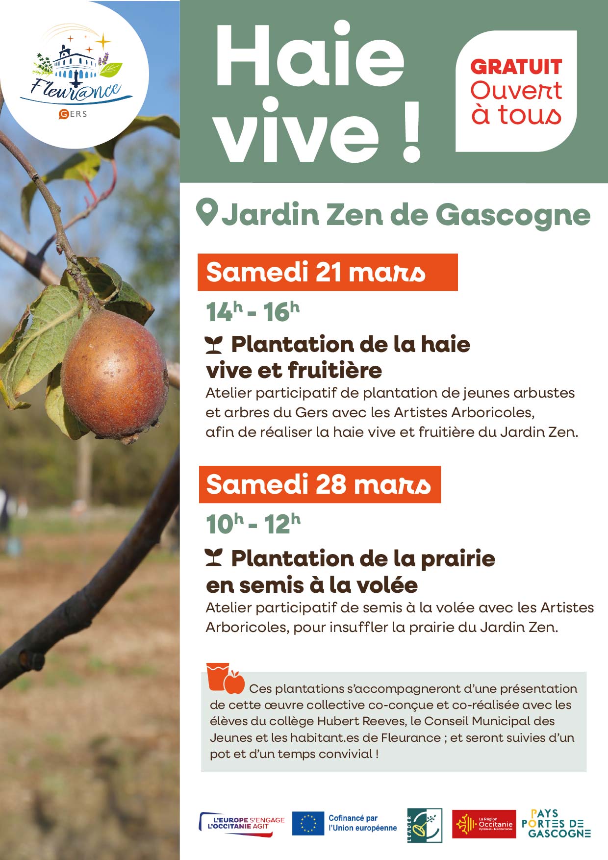 Ces plantations s'accompagneront d'une présentation de cette œuvre collective co-conçue et co-réalisée avec les élèves du collège Hubert Reeves, le Conseil Municipal des Jeunes et les habitant.es de Fleurance ; et seront suivies d'un pot et d'un temps convivial !