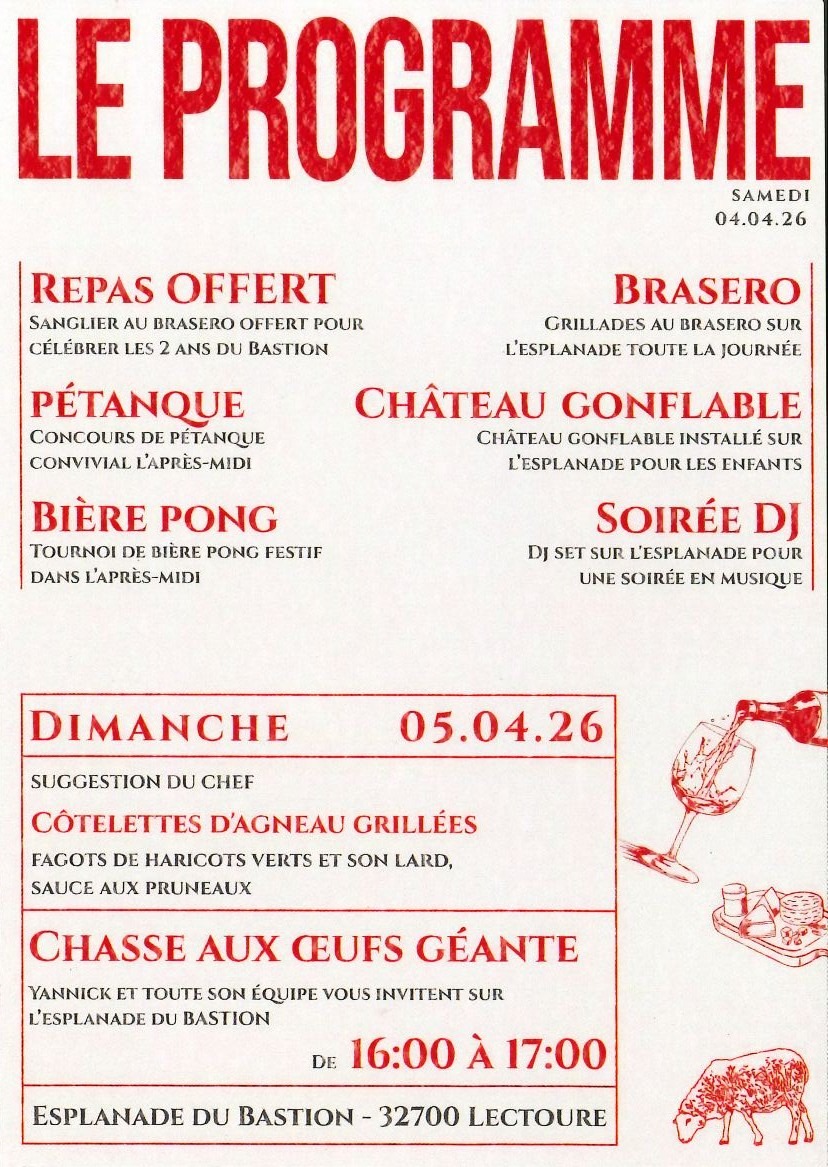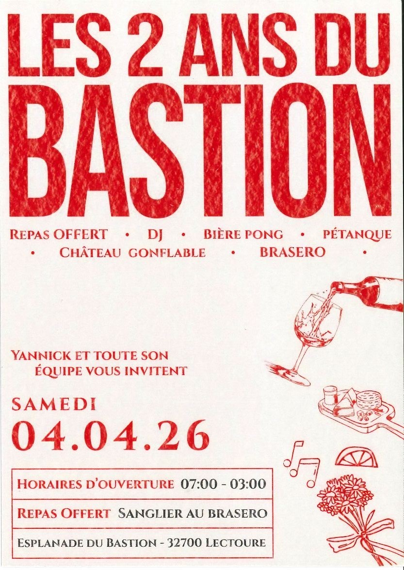 Les 2 ans du Bastion à Lectoure. Le 04 avril : repas offert avec sanglier au brasero, de 7h à 3h, DJ, bière pong, pétanque, château gonflable.