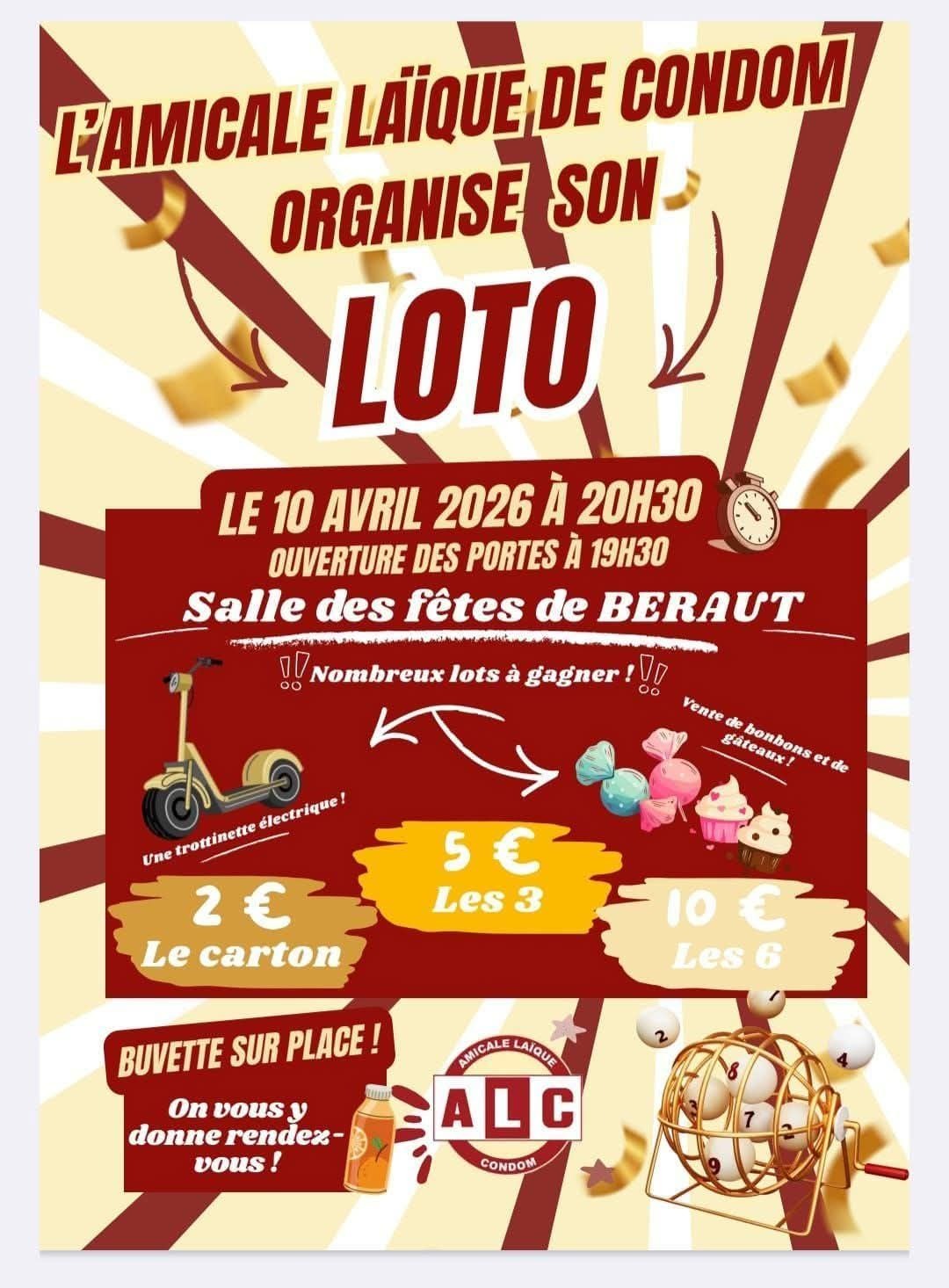 L'Amicale Laïque de Condom organise son loto à la salle des fêtes de Béraut à 20h30.