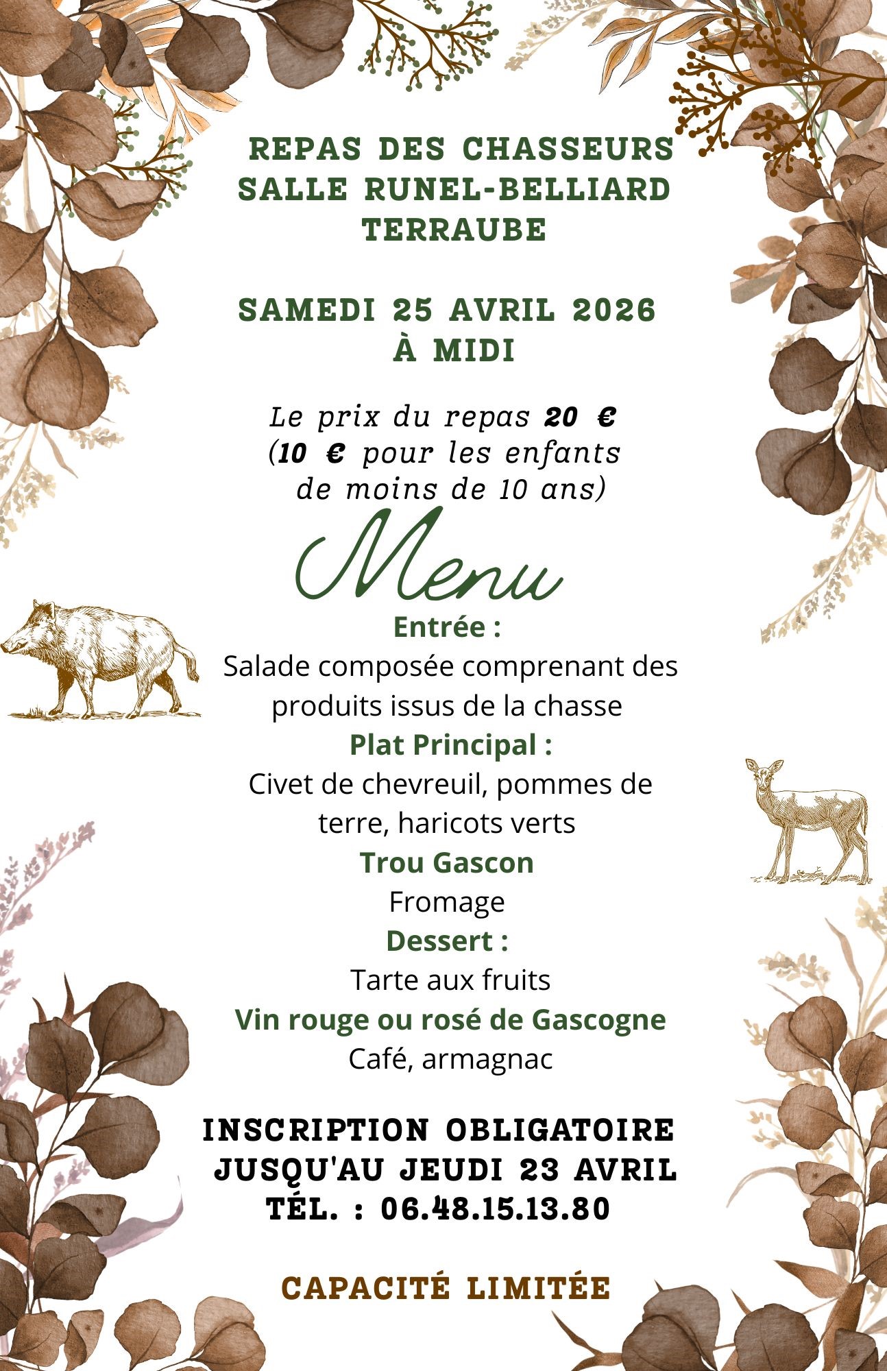Le repas des chasseurs se tiendra à la salle Runel-Belliard à Terraube. Au menu, une salade composée de produits de la chasse en entrée, suivie d'un civet de chevreuil accompagné de pommes de terre et haricots verts. Le repas se poursuivra avec du fromage Trou Gascon et une tarte aux fruits en dessert. Vin rouge ou rosé de Gascogne, café et armagnac seront également servis. L'inscription est obligatoire et la capacité est limitée. Ne manquez pas cette occasion de découvrir les saveurs de la chasse dans une ambiance chaleureuse.