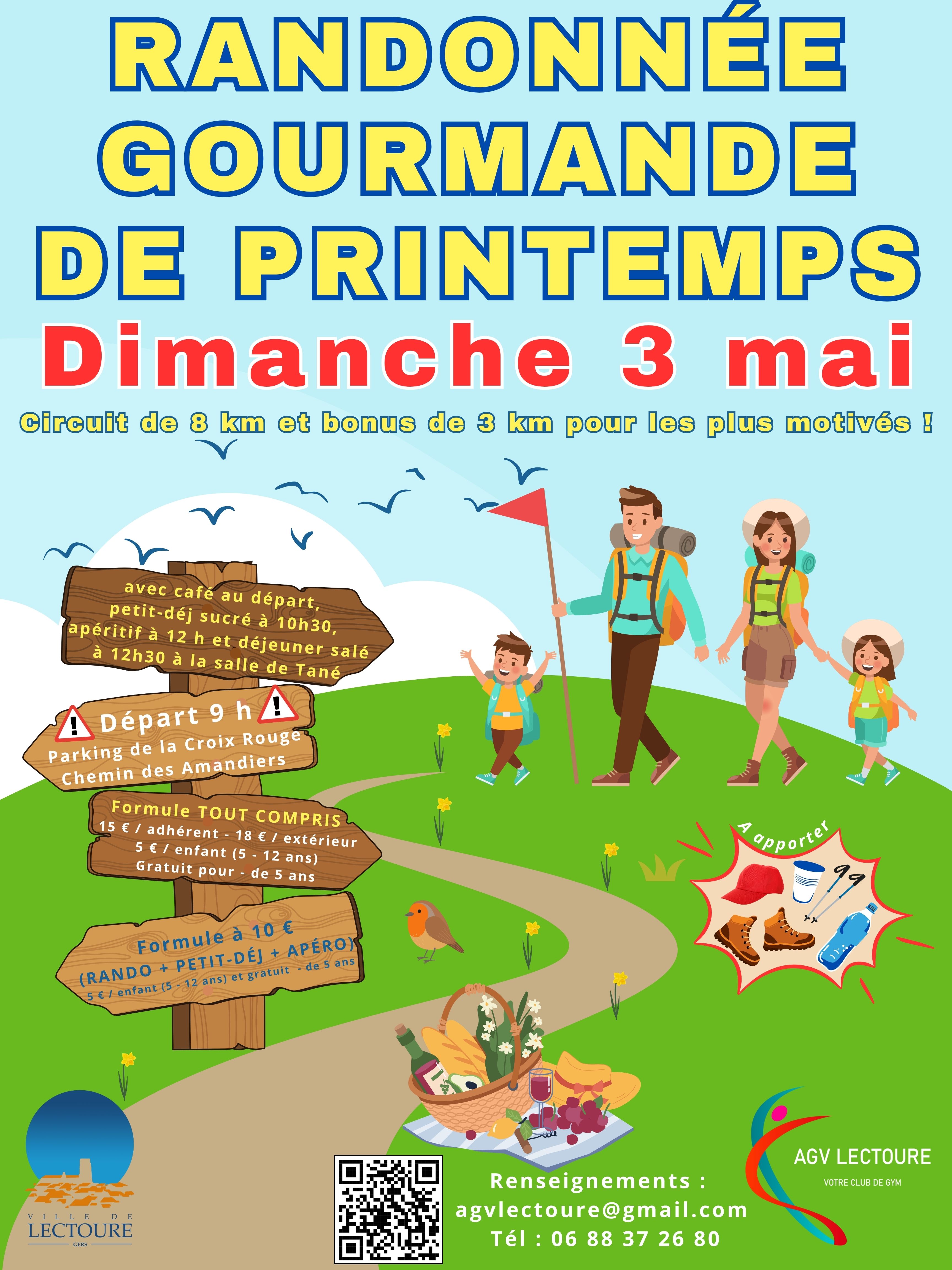 Randonnée gourmande de printemps avec un circuit de 8 km et un bonus de 3 km. Au programme : café au départ, petit-déjeuner sucré, apéritif et déjeuner salé.